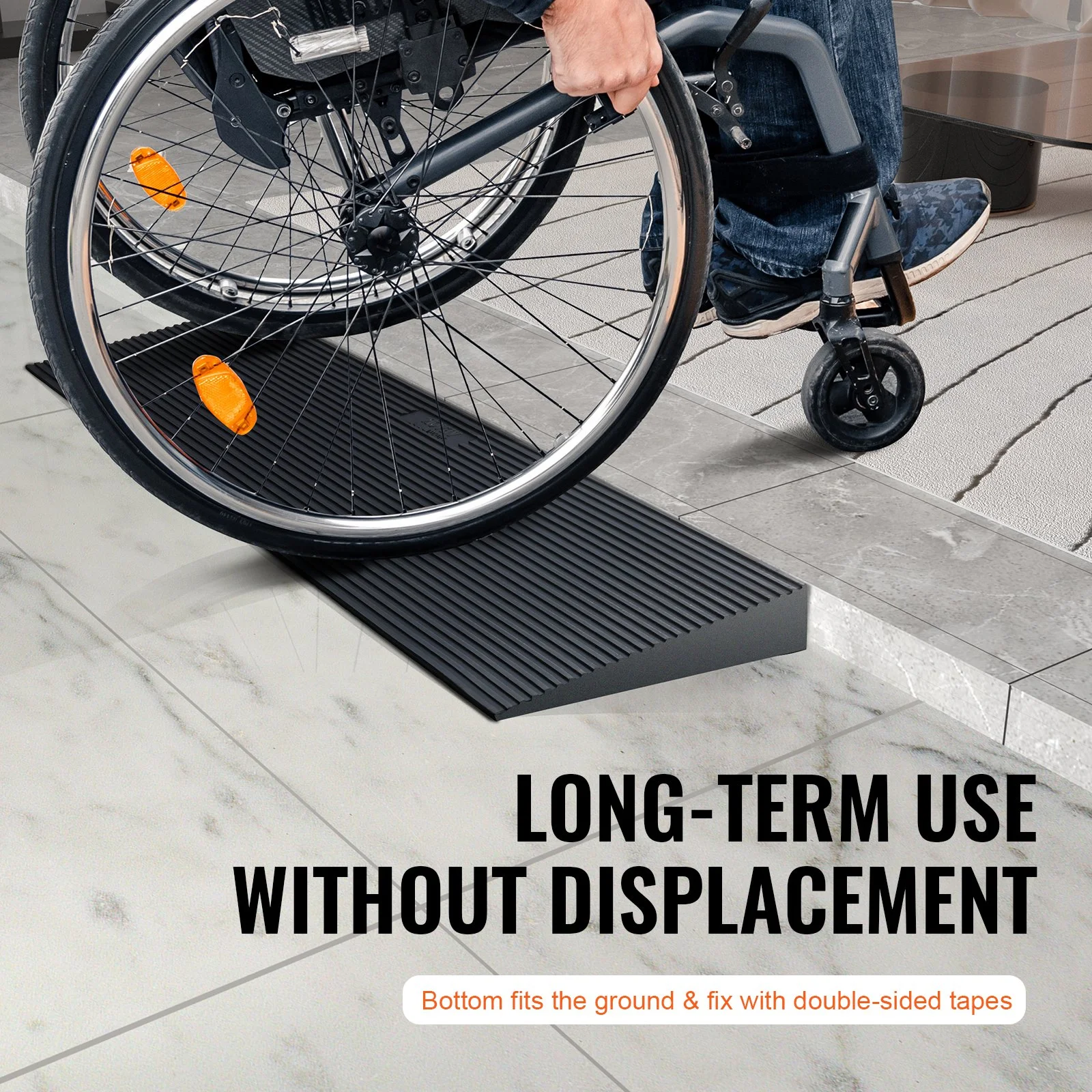 The solid threshold ramp fits the ground, equipped with a roll of double-sided adhesive, firmly fixed on the floor or smooth tiles, and it is not easy to shift when placed in garages, doorways, roadsides, supermarkets and other places.