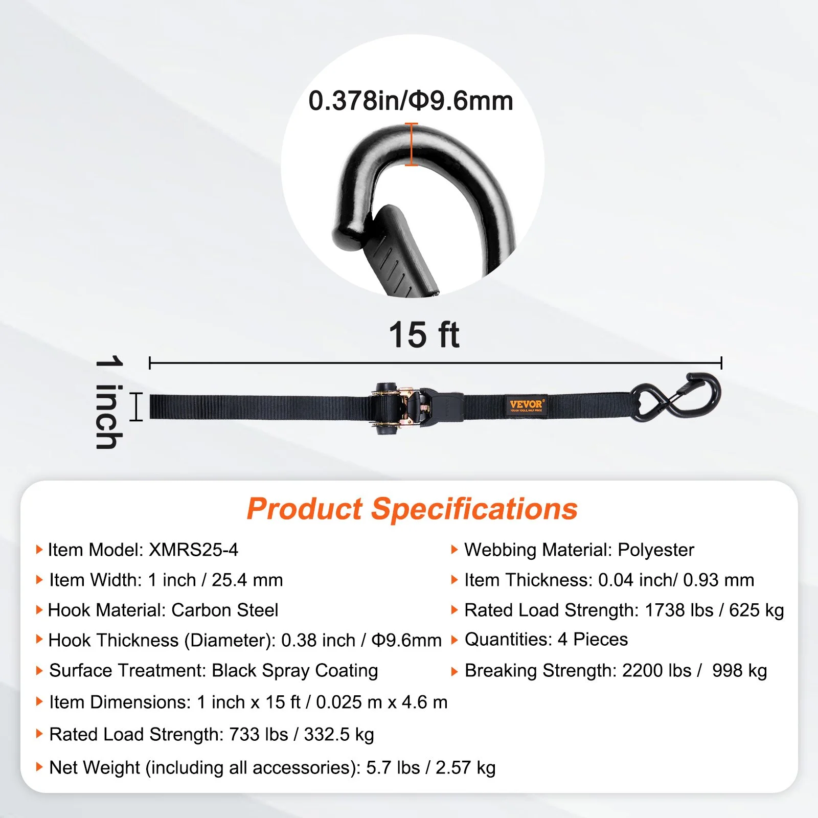 VEVOR ratchet straps provide durable and reliable security for transporting various small and large objects, including motorcycles, canoes, kayaks, ATVs, boxes, boats, furniture, lawn equipment, heavy machinery, and other cargo via truck beds, trailers, or roof racks.
