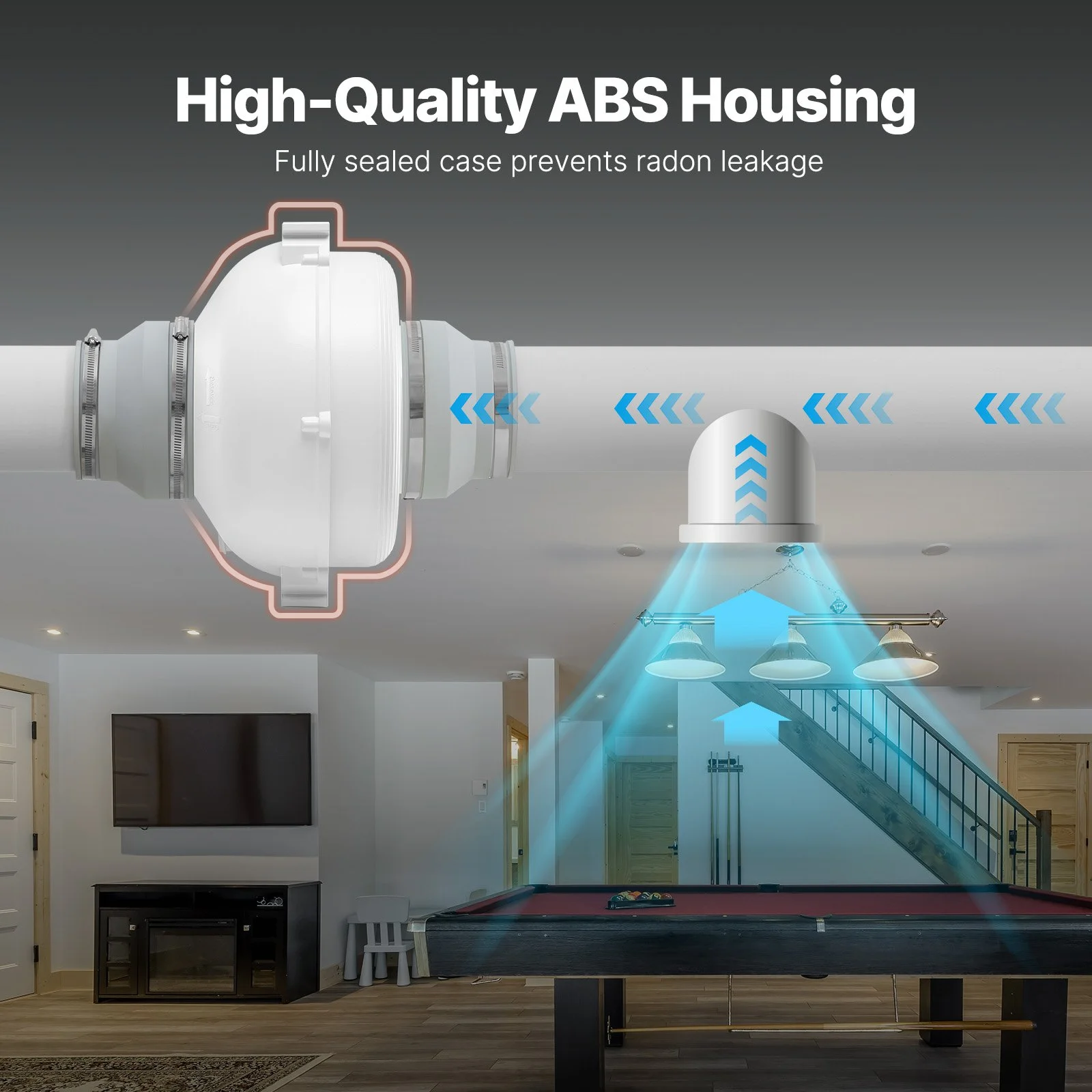 Constructed with high-quality ABS, the durable housing features a fully sealed design that effectively prevents radon leakage, ensuring the fan's security and reliability.