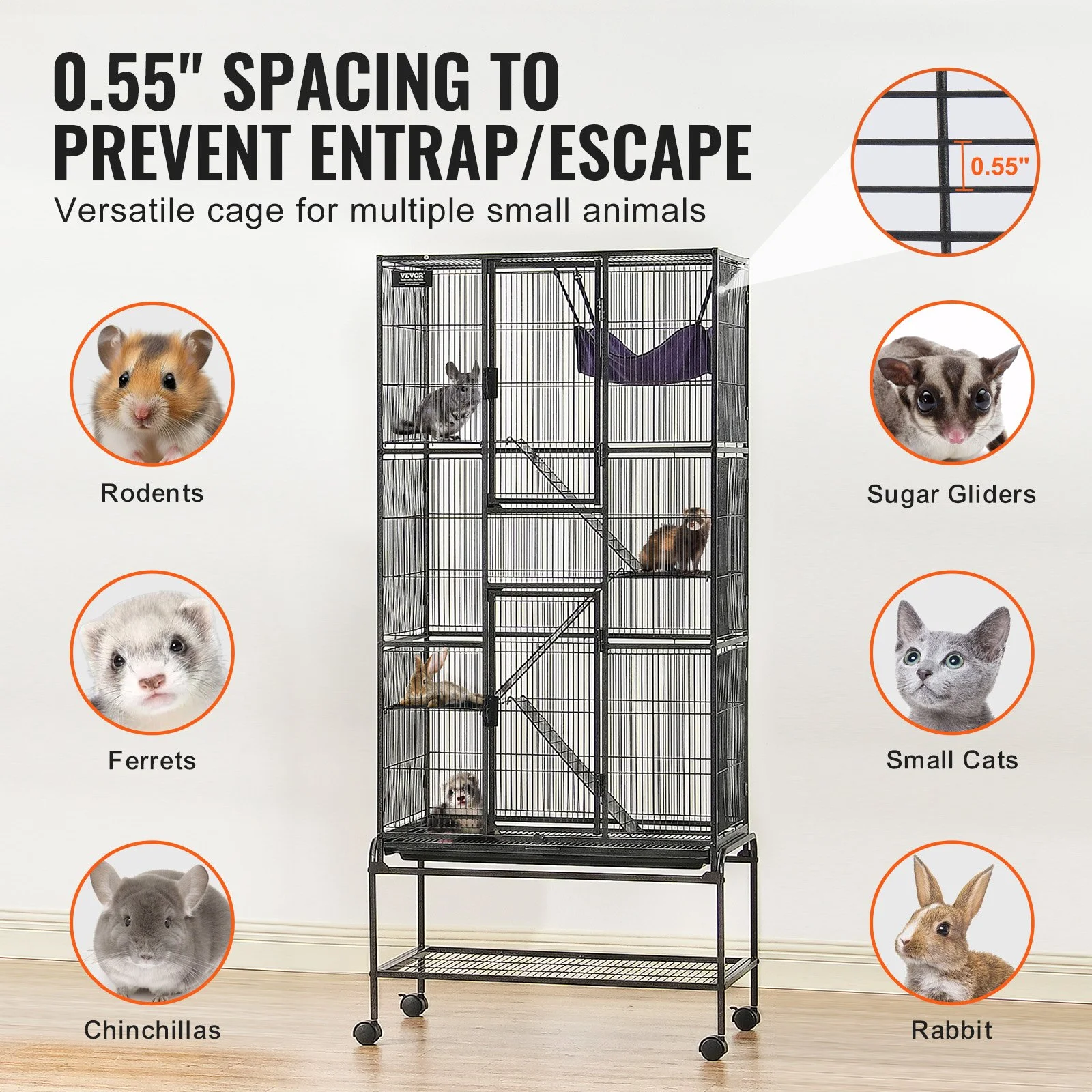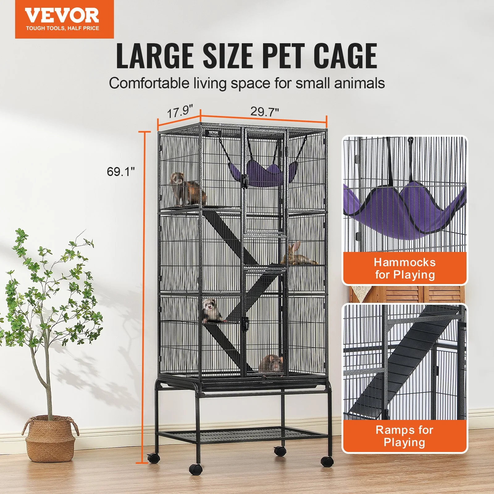 Provide your pets with a roomy 29.7"x17.9"x69.1"/755x455x1755 mm ferret cage. With 4 different height platforms and 3 slip-proof ramps, it accommodates multiple pets and provides them plenty of entertainment and exercise options. Enjoy comfortable experience with the top hammock!