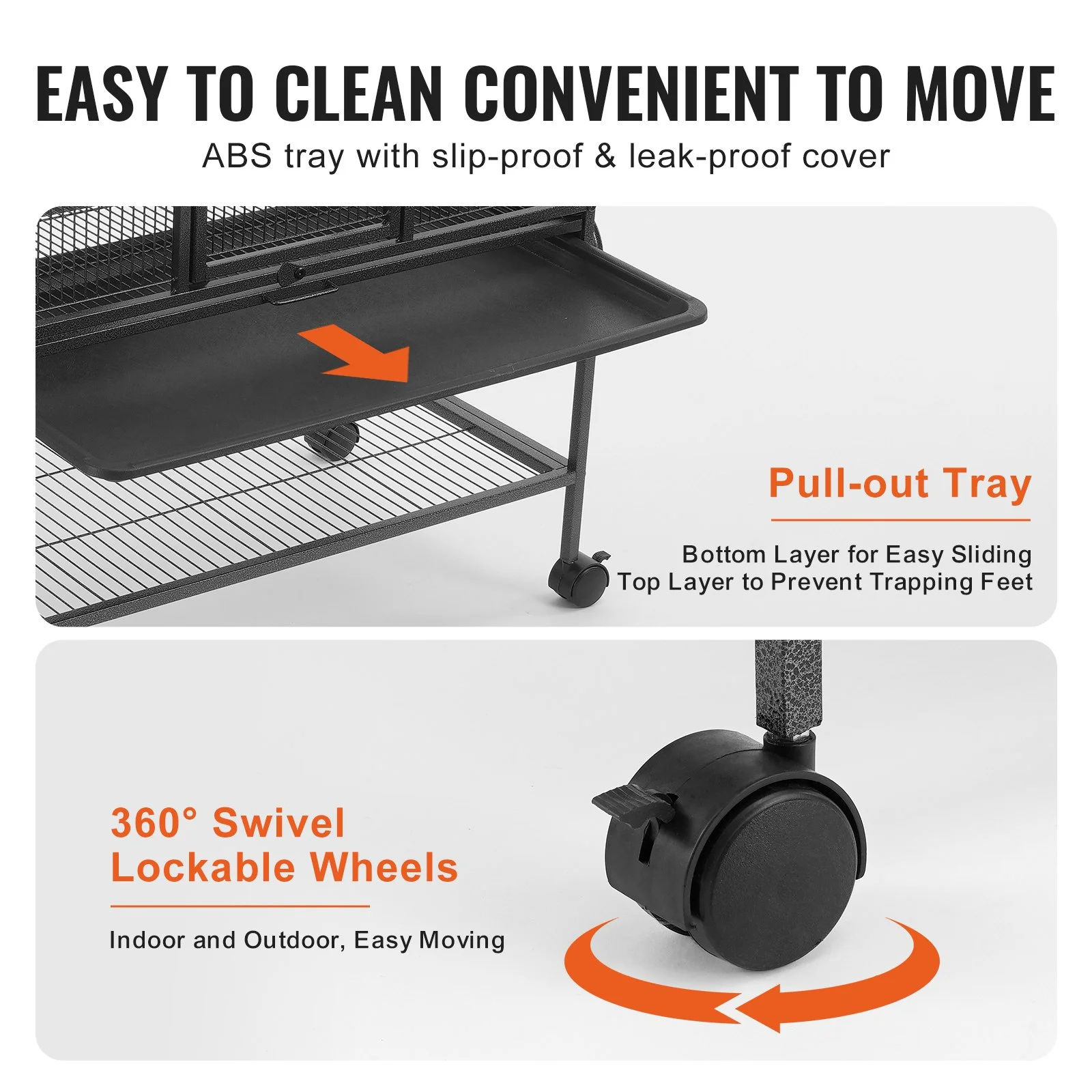 Our metal rolling pet cage comes with lockable rolling wheels, allowing easily move your pets from indoors to outdoors, letting them enjoy sunlight and nature. There is a spacious storage shelf, perfect for placing pet supplies. The shelf can be split into sections, offering more flexible storage options!