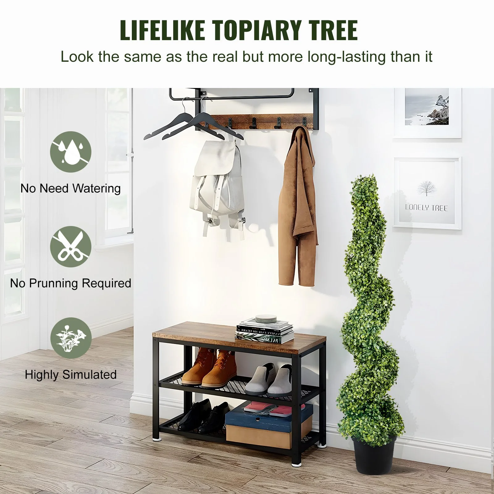 The staggered leaves for added visual appeal and realism and require minimal upkeep. They don't need watering, trimming, or fertilizing. The densely arranged leaves effectively conceals the inner framework of the topiary, ensuring a seamless and cohesive appearance. NOTE: 1. Each case contains 2 units. 2. Please read the product page carefully to check the dimensions and ensure the size fits your space or flower pots. Contact customer service for personalized advice if needed