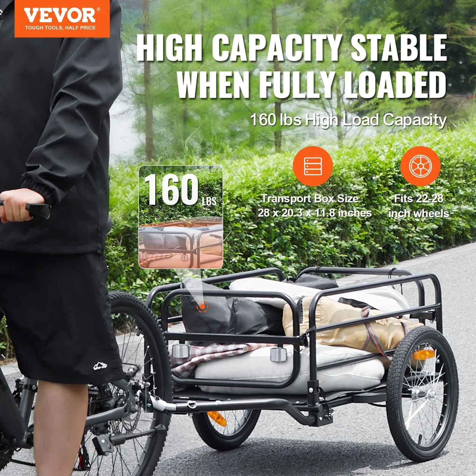 Our bike cargo trailer is your ultimate travel companion, providing a sturdy build and a spacious design capable of handling up to 160 lbs of cargo. Perfect for all your outdoor adventures, from camping trips to picnics, it's the ideal solution for hauling your essentials wherever you go.