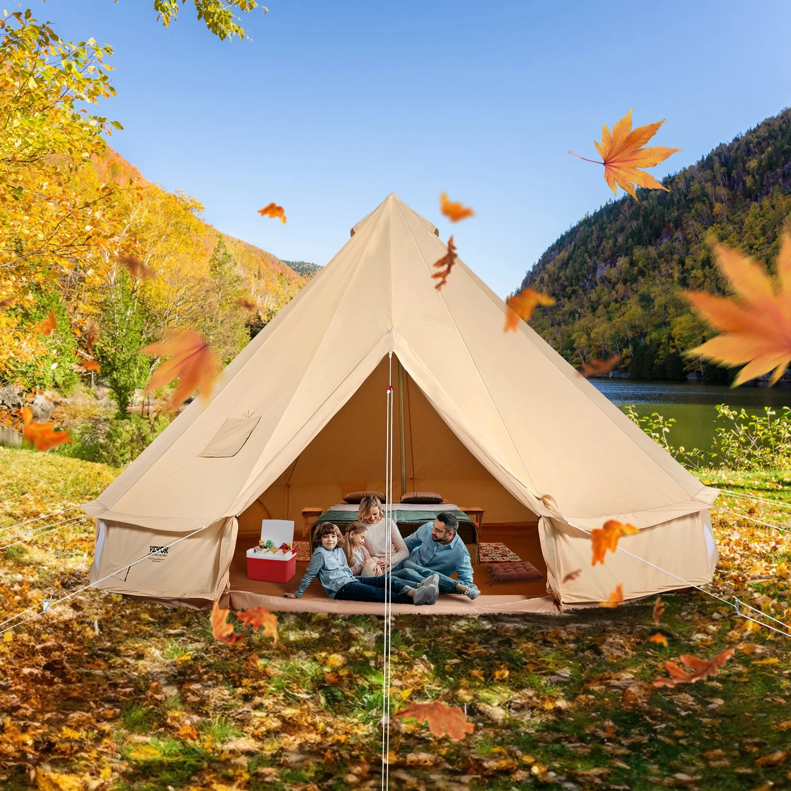 Made from TC cotton canvas (65% polyester and 35% cotton blend), our canvas bell tent is durable, waterproof, and breathable, suitable for light to moderate rain conditions. Additional waterproof cover is recommended for heavy rain or storms. The ground mat is a special thick mat made from 540gsm waterproof PVC, offering snow and wind resistance to keep you dry and comfortable.