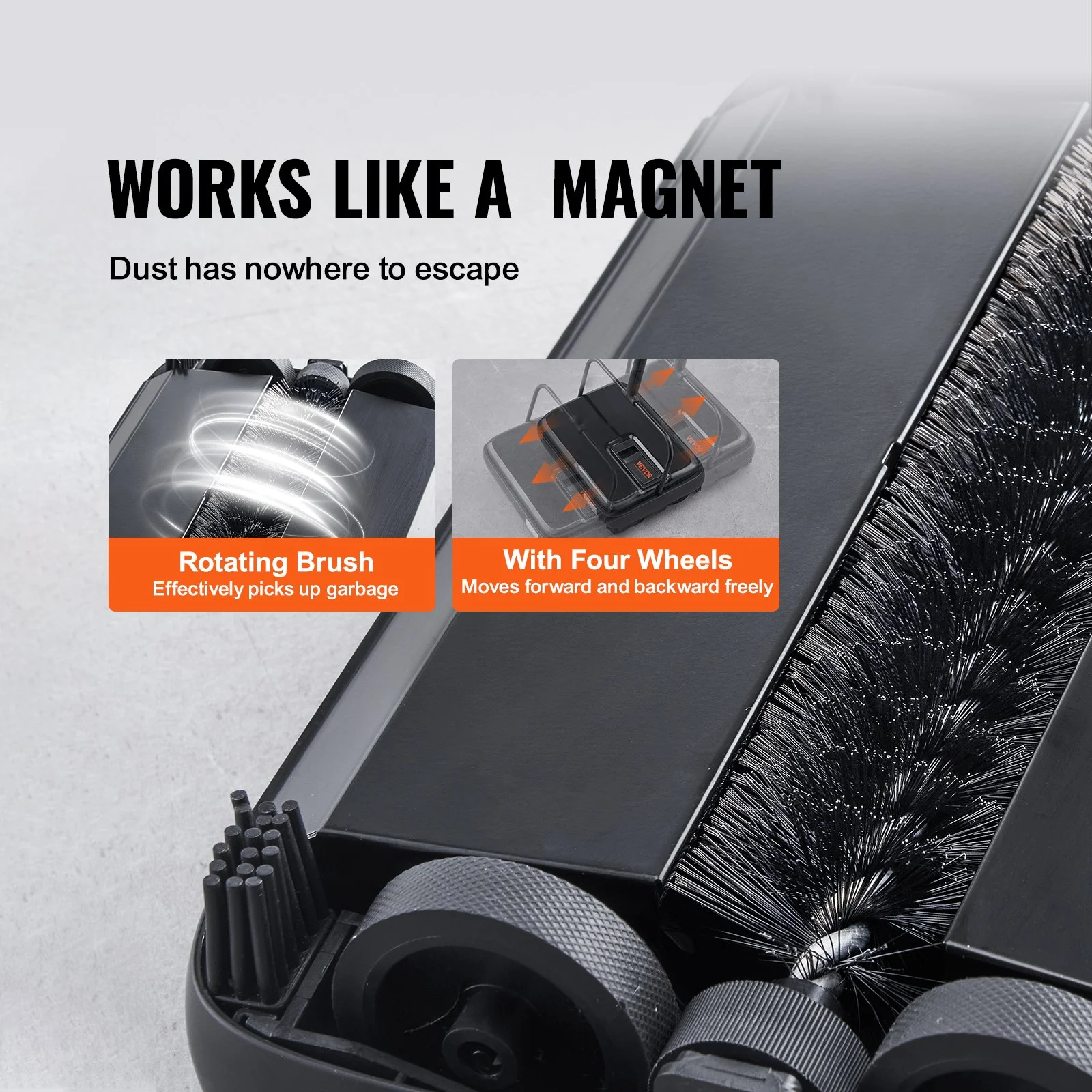 The carpet sweeper manual push is equipped with a roller brush that acts like a magnet, efficiently picking up garbage and dust. With its four-wheel design, it moves freely both forward and backward, making cleaning a breeze.