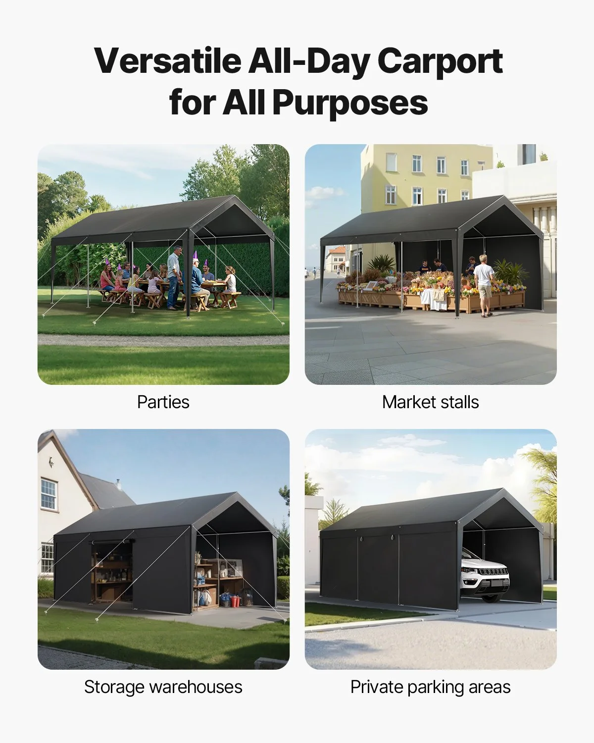The carport features a double-coated PE tarp that is UV-resistant and waterproof, providing long-term protection for your car, RV, or outdoor equipment from rain, strong sunlight, and natural elements like dust.
