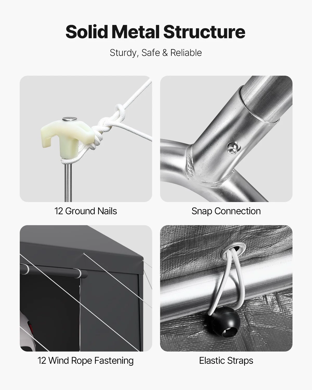Made with galvanized steel pipes, the frame resists rust. The car canopy comes with alloy steel frame that is stronger and more durable than regular steel, able to withstand higher wind pressure and heavier weight, ensuring long-lasting use. Equipped with wind ropes and ground stakes for added stability in windy conditions.