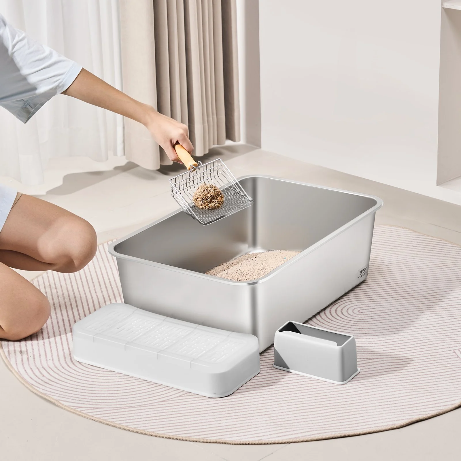 The curved high walls clear away hard-to-reach corners, ensuring no hidden messes. The included metal scoop features both large and small holes for precise litter filtering, making cleanup quick and easy.