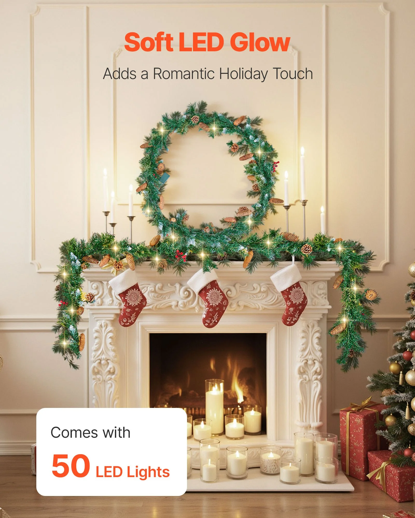 Equipped with 50 warm white LED lights, this greenery garland gives off a cozy glow at night, adding a magical touch to your decor and enhancing the holiday atmosphere. Requires 3 AA batteries (not included)
