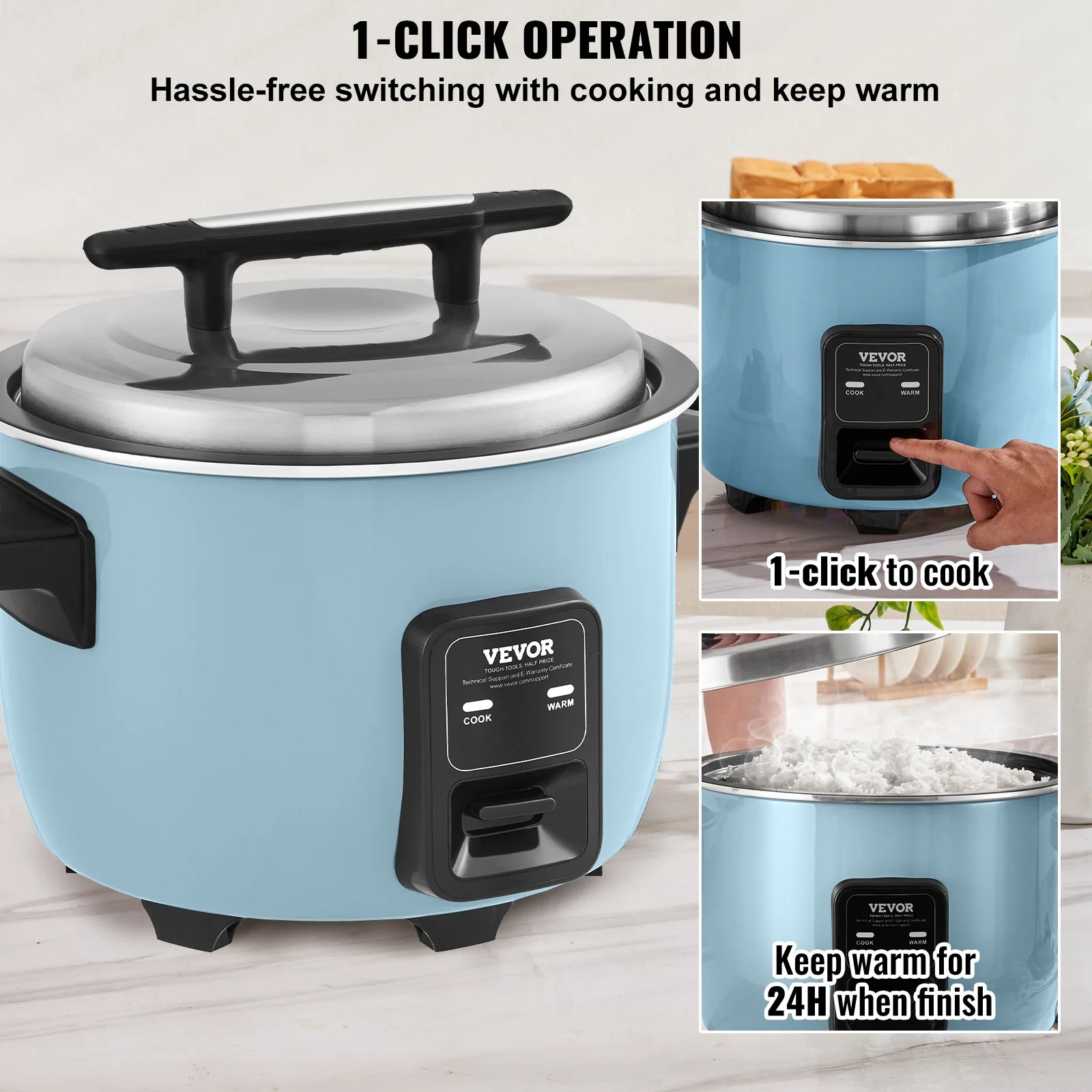 The VEVOR commercial rice cooker is made entirely from high-quality materials, resistant to rust and corrosion, durable, and resistant to wear even with long-term use. It's easy to clean and maintain, extending its service life.