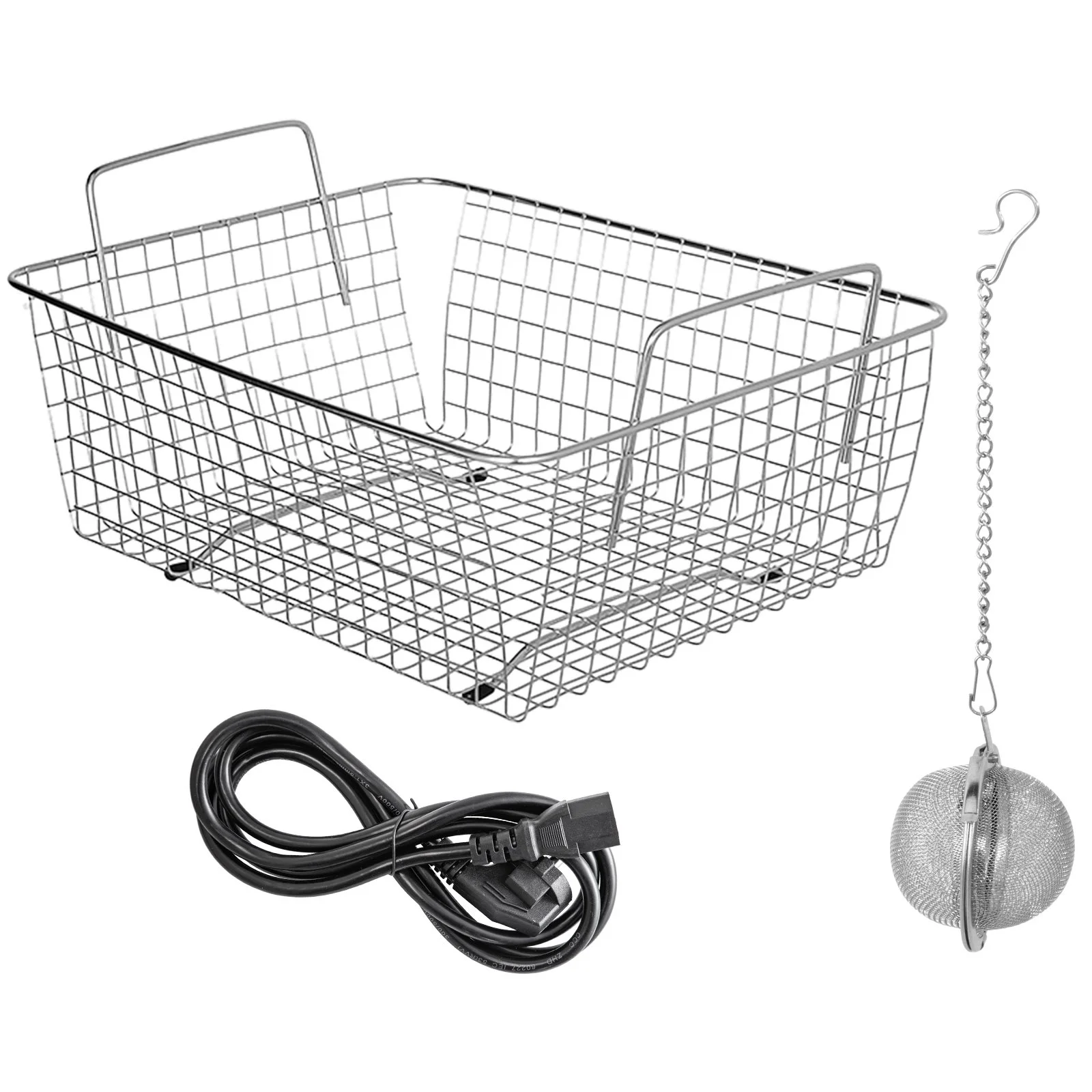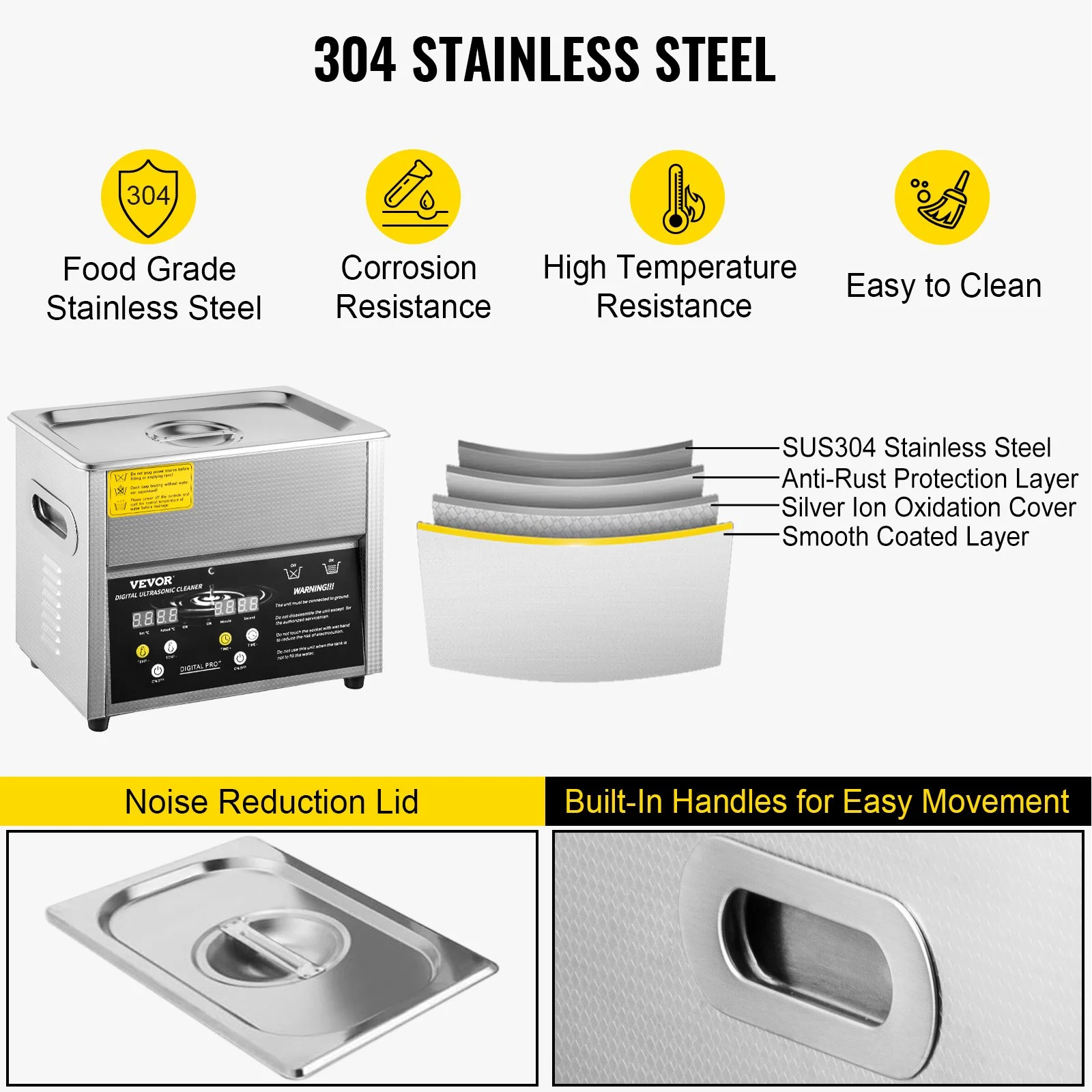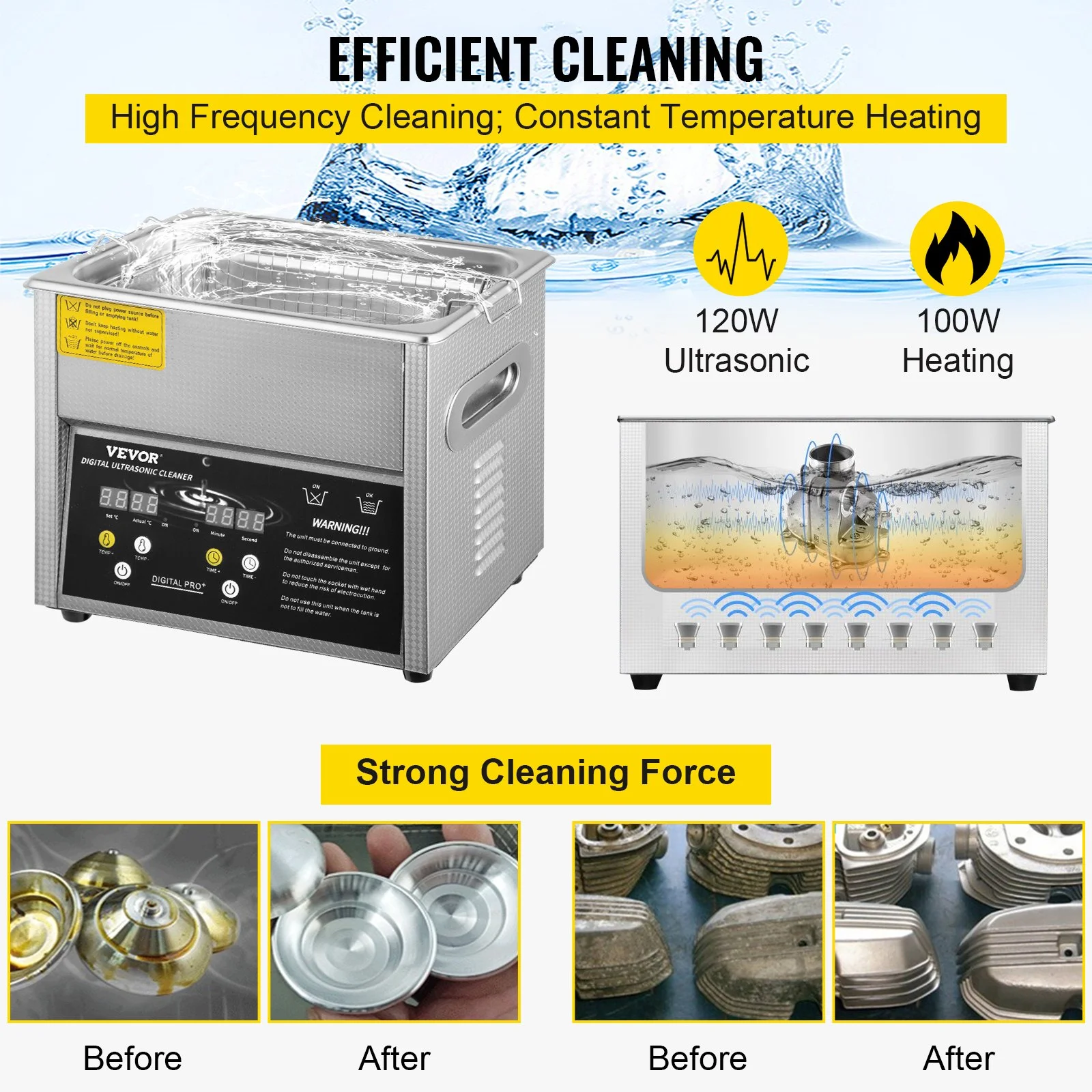 3L/0.8 Gal; Heating Power: 100W; Ultrasonic Power: 120W. This ultrasonic cleaner machine is constructed with sturdy 304 stainless steel, ensuring no water leakage and long service life. An extra basket is available to decrease collision between sharp items and the tank.