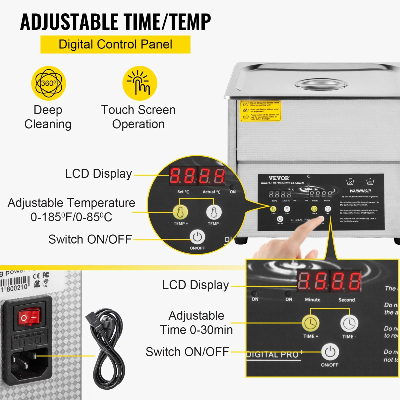 DIGITAL CONTROL PANEL - The jewelry cleaner ultrasonic machine features a digital control panel, with an adjustable timer (0-30 min) and heater (0-185_/0-85_) displayed on LCD. A heating function can effectively soften and dissolve oil and wax stains, thereby improving the cleaning effect.