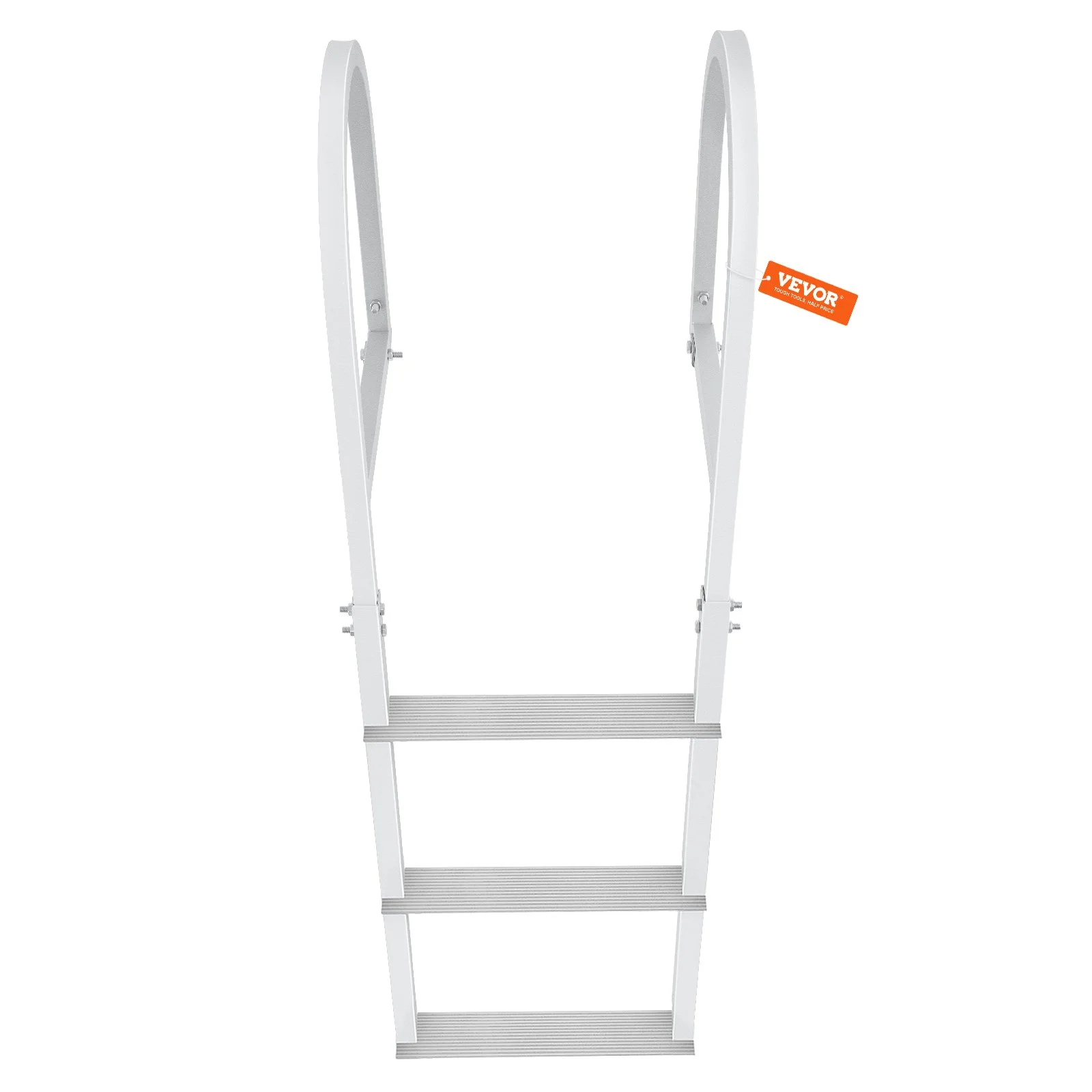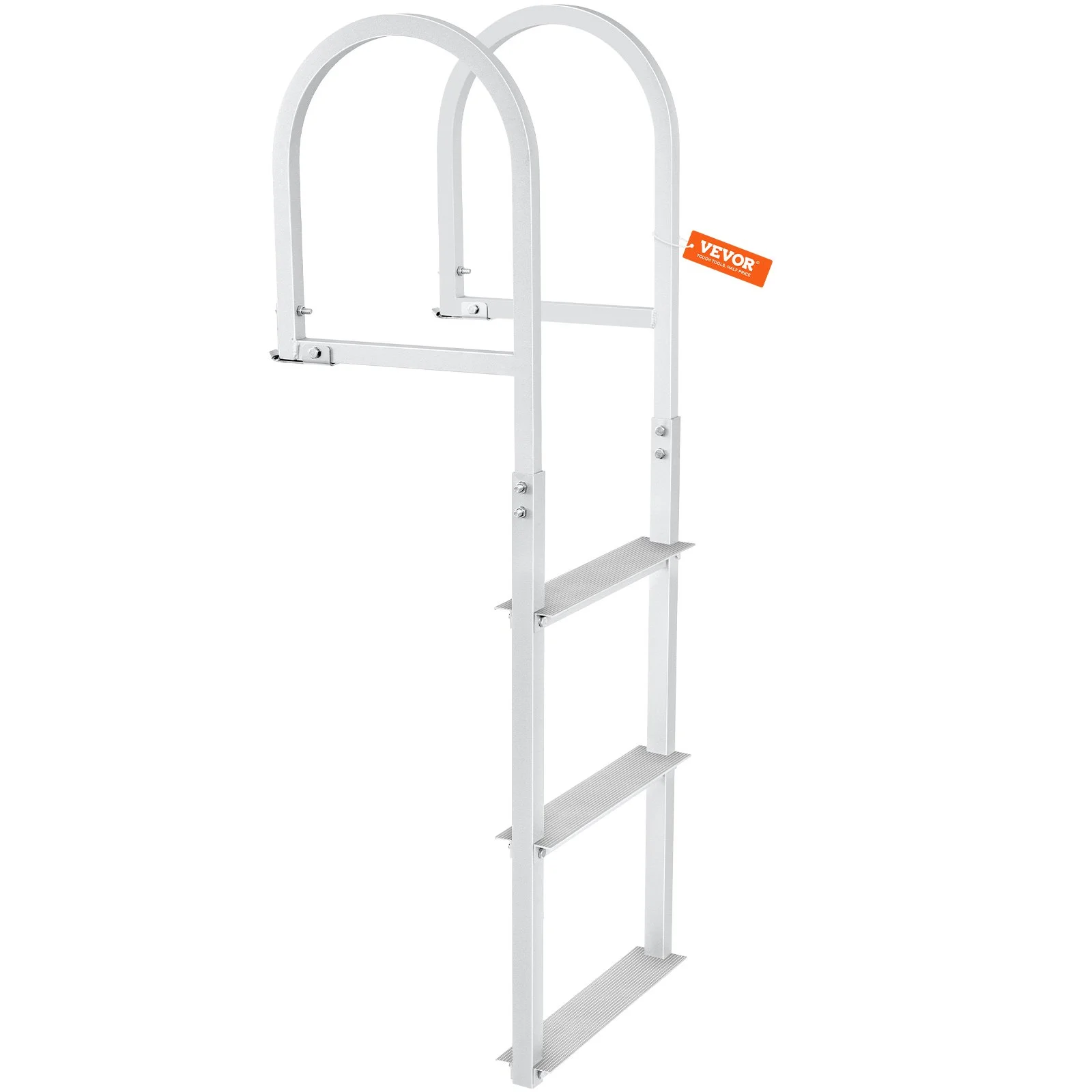 Our dock ladder features buckles design. Fix the snap ring bracket on the ground for the first time, and when the ladder is not in use, just pull the buckles out of the snap ring rack.