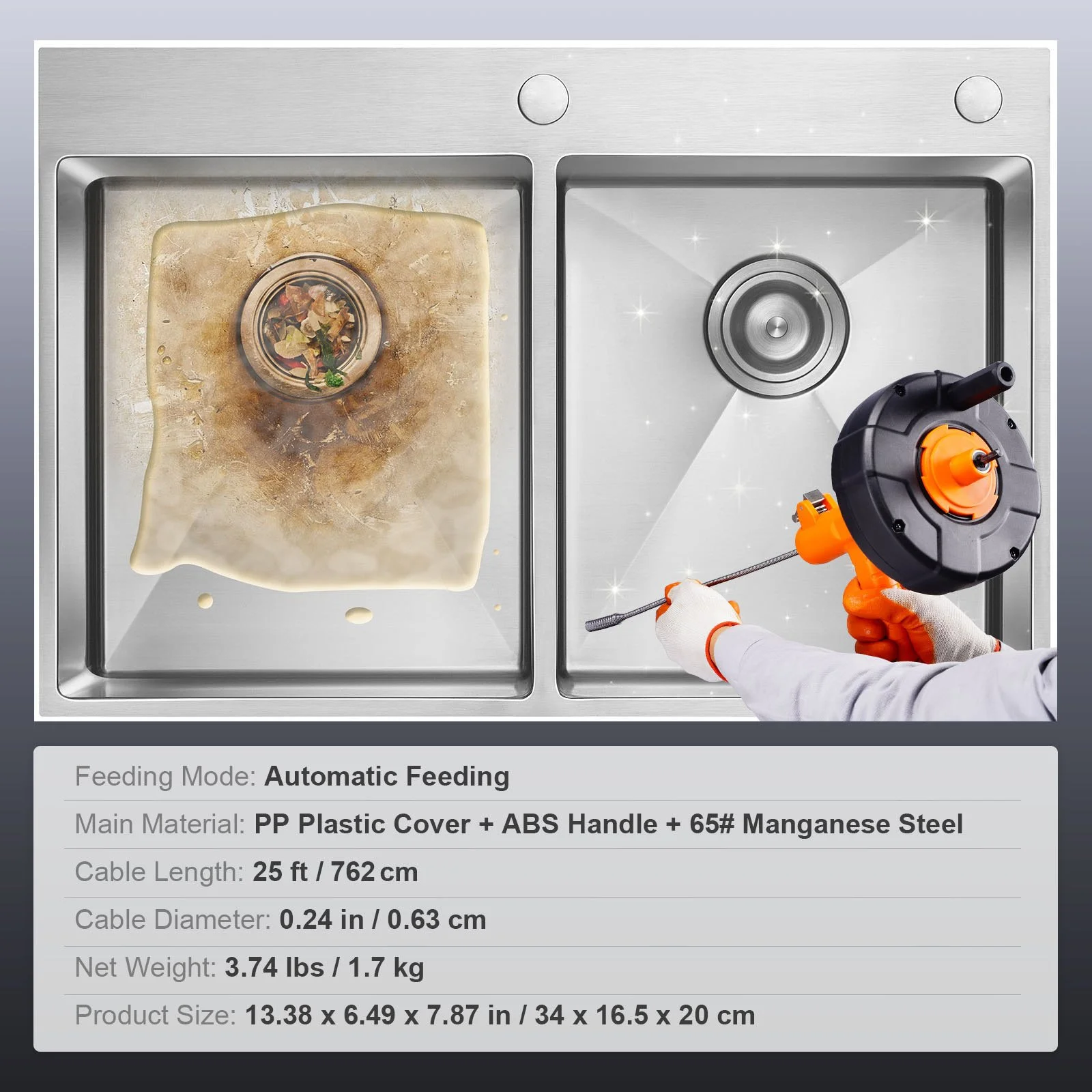VEVOR handheld plumbing snake drain auger offers good versatility and cost effectiveness, quickly clearing debris from the most stubborn drains such as tea, peel, food residue, paper, bone, hair, and clothing unclogged in toilets, sewers, floor drains, sinks, pipelines, bathtubs.