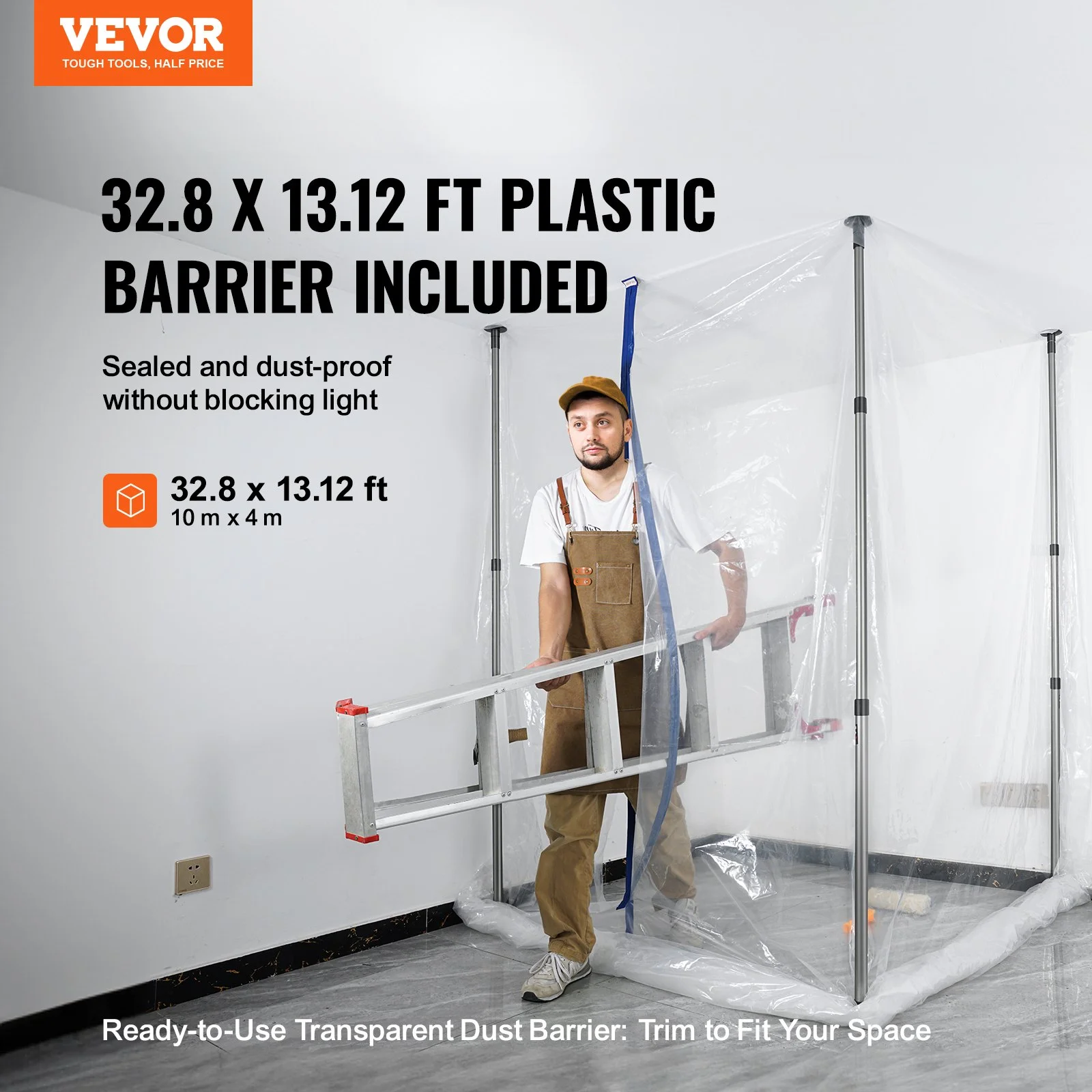 Our dust barrier system includes a 32.8ft x 13.1ft large plastic barrier, ready to use and providing excellent sealing to prevent dust leakage. The transparent material doesn't block light, making it suitable for interior decoration, painting, and more. The plastic barrier can be trimmed, providing professional dust protection for residential and commercial renovations.