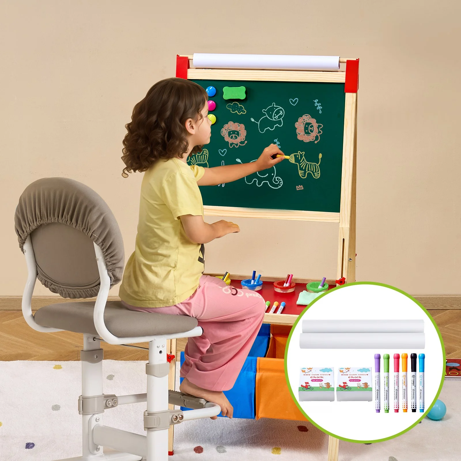 This easel accessory set includes 24 dust-free chalks, 6 markers, and 2 paper rolls-perfect for kids aged 3 to 10. Whether they're into doodling, writing, or drawing, this set provides everything they need for a fun and creative adventure!