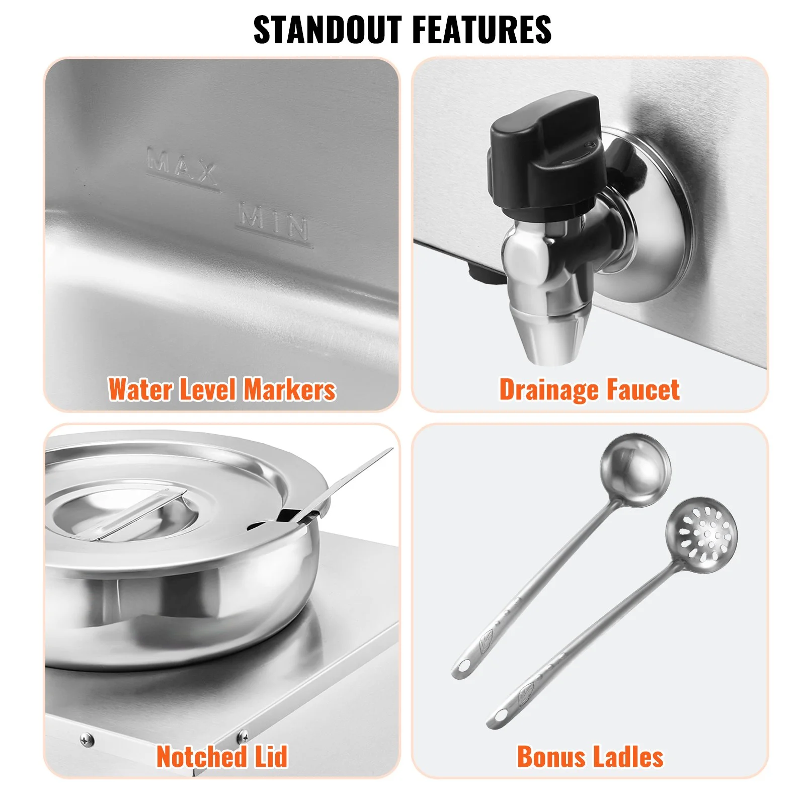 Our commercial soup warmer comes equipped with Three 7.4Qt round pots with their respective lids, allowing you to serve different dishes simultaneously. Feel free to change up your menu from soups and sauces to stew, or even nacho cheese and chocolate.
