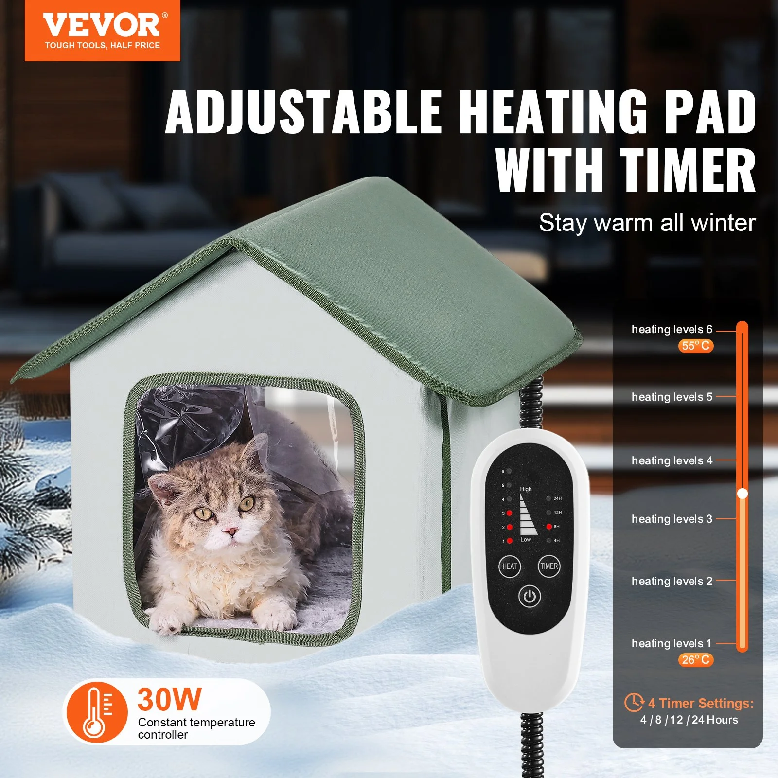 This heated cat house features a 30W waterproof heating pad that provides a 19°C /66.2°F temperature increase, and allows for timer settings of 4/8/12/24 hours, ensuring your pet stays warm for winter or cold climates. With built-in power failure protection and an intelligent thermostat, it offers over-temperature and over-current protection. (Note: The heating pad requires about 10 minutes to warm up-please be patient as it heats.)