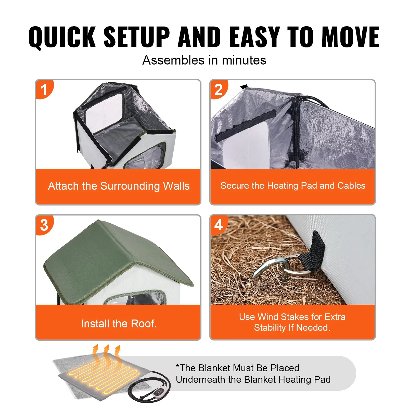 The interior utilizes thermal insulation materials like aluminum foil and pearl cotton, effectively reflecting and retaining heat, preventing heat loss from the cat shelter. A blanket is included to assist in keeping your cat warm, working in tandem with the heating pad to ensure your cat’s belly and other body parts stay cozy.