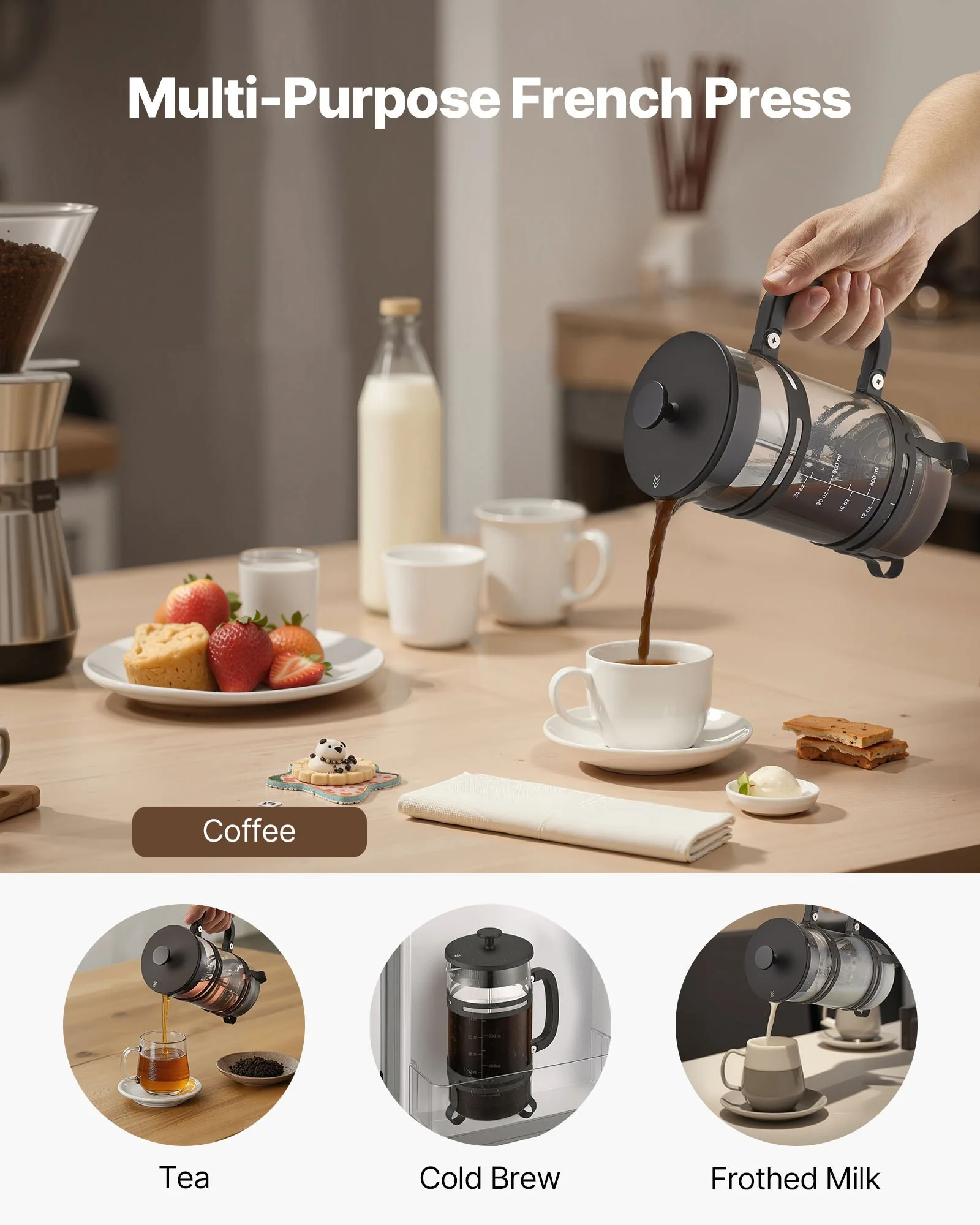 Made of premium borosilicate glass, this French press coffee maker is heat-resistant, impact-resistant, and crystal clear-letting you enjoy the full brewing process with improved visibility and experience