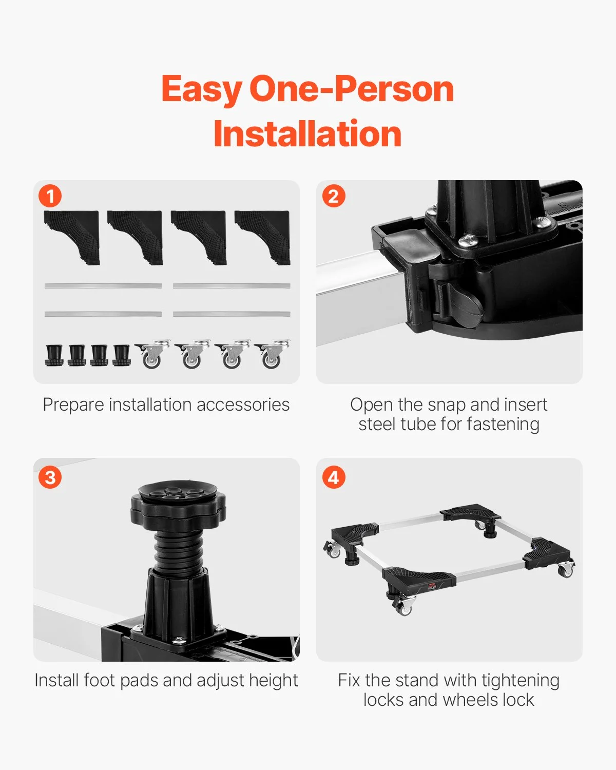 Glide across floors with ease! The 4 swivel dual wheels of our washing machine dolly allow smooth movement on any surface without causing any damage. When it’s time to stop, the locking mechanism ensures your appliance stays firmly in place during operation, providing stability and security.