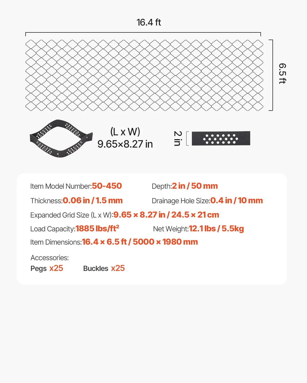 Size: Each unit measures 16.4 ft long x 6.5 ft wide, covering 106.56 sq ft. The smaller units of 9.65in x 8.27in stabilize gravel or soil within each grid cell. The 2 inch deep ground grid is ideal for creating a firm surface on slopes or flat areas (especially on soft or unstable terrain). It also helps avoid further erosion and allows immediate foot or vehicle traffic