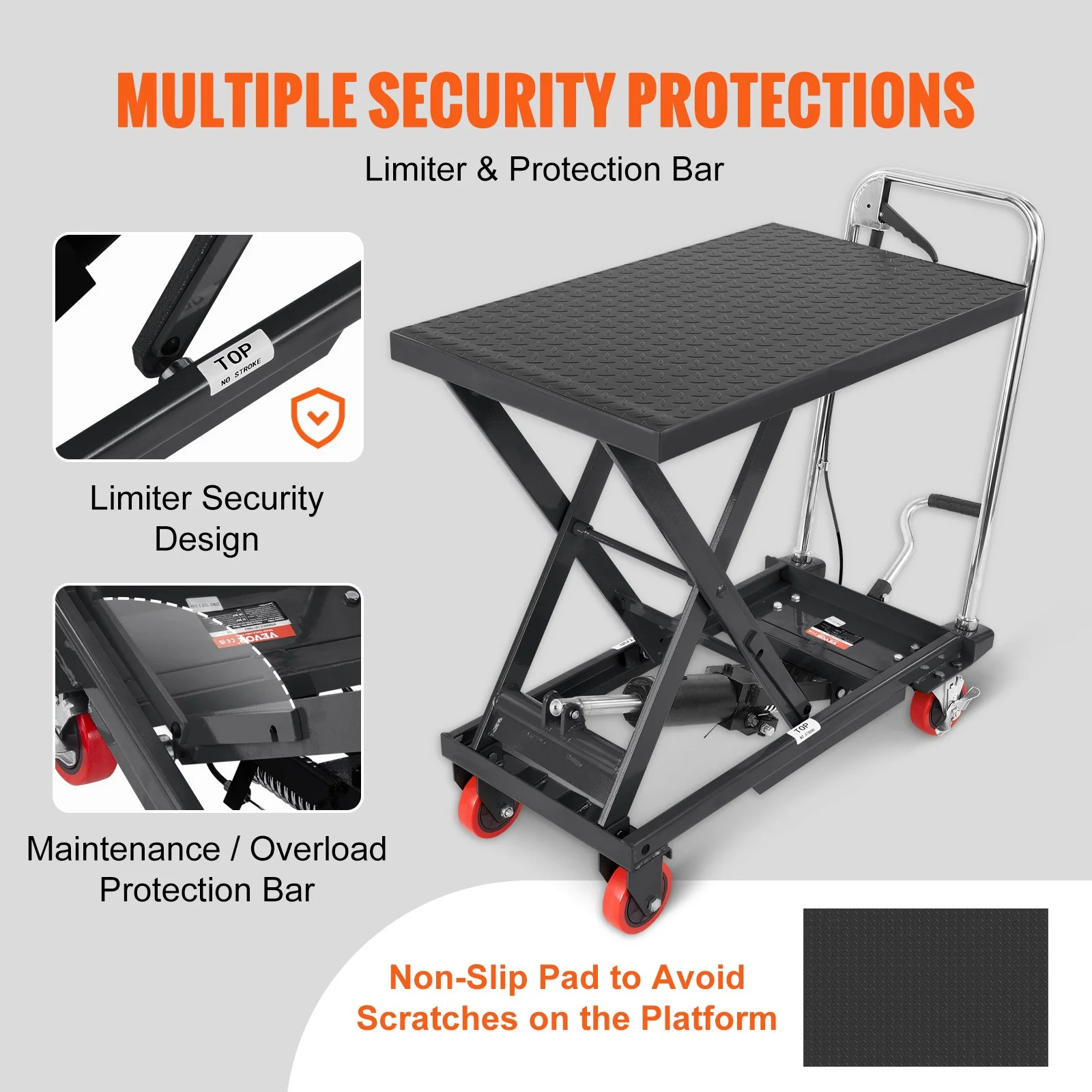 Our hydraulic table cart incorporates thoughtful security features, including limiter protection to prevent over-lifting. It also features a maintenance/overload protection bar for easy maintenance. For added stability during transport, we provide a rubber non-slip pad that prevents movement and enhances overall stability.