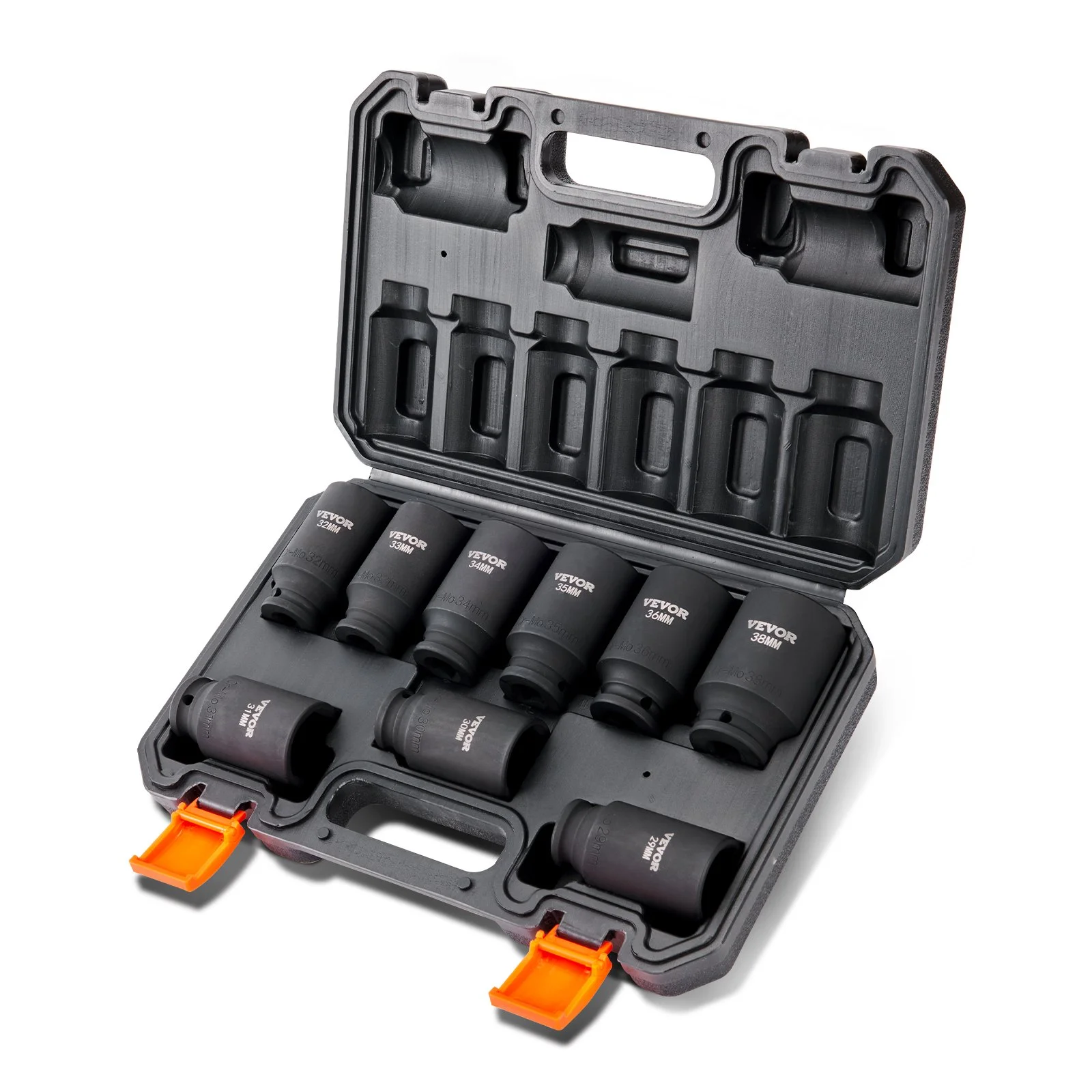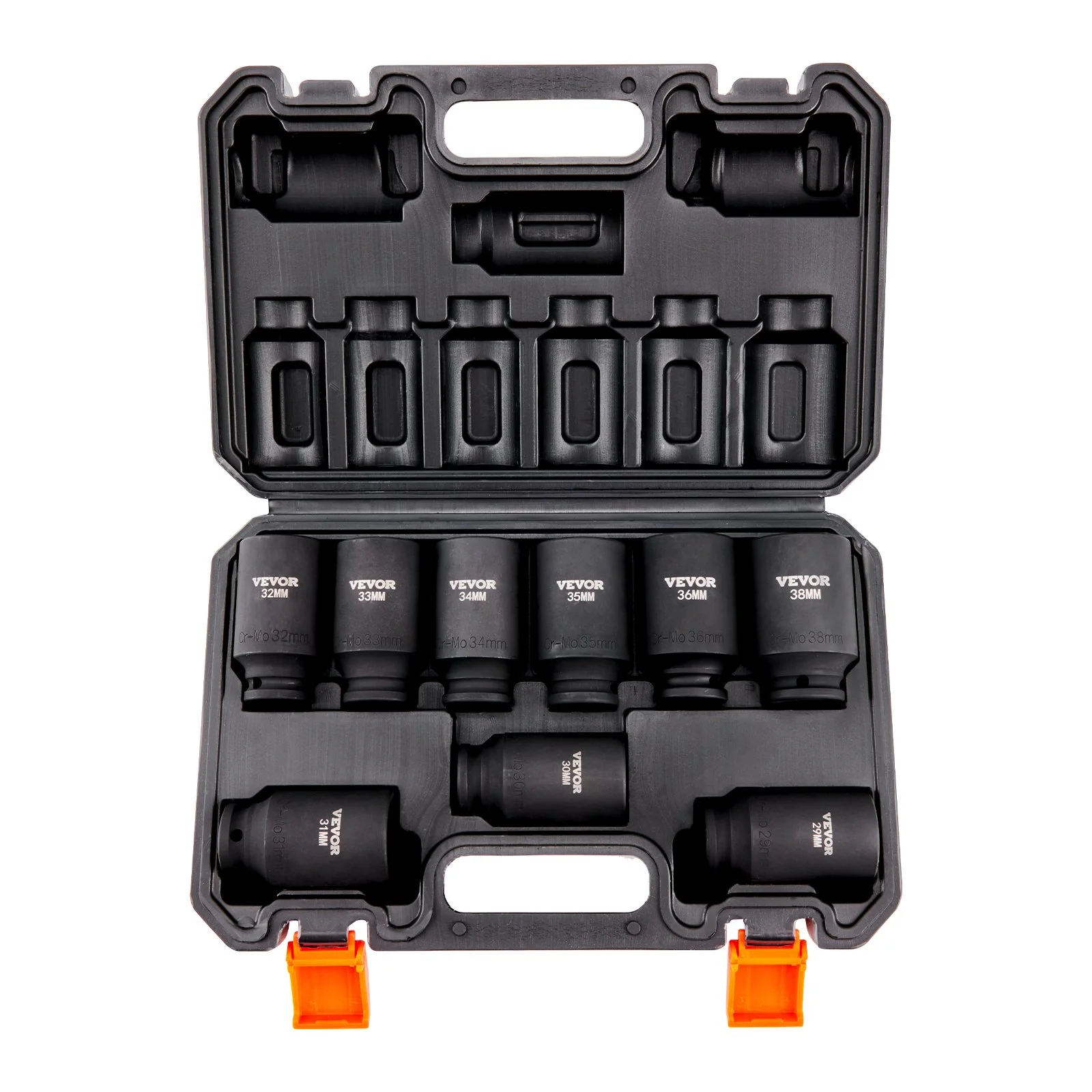 This comprehensive set includes 9pcs 1/2" metric deep impact sockets: 29 mm, 30 mm, 31 mm, 32 mm, 33 mm, 34 mm, 35 mm, 36 mm, 38 mm.