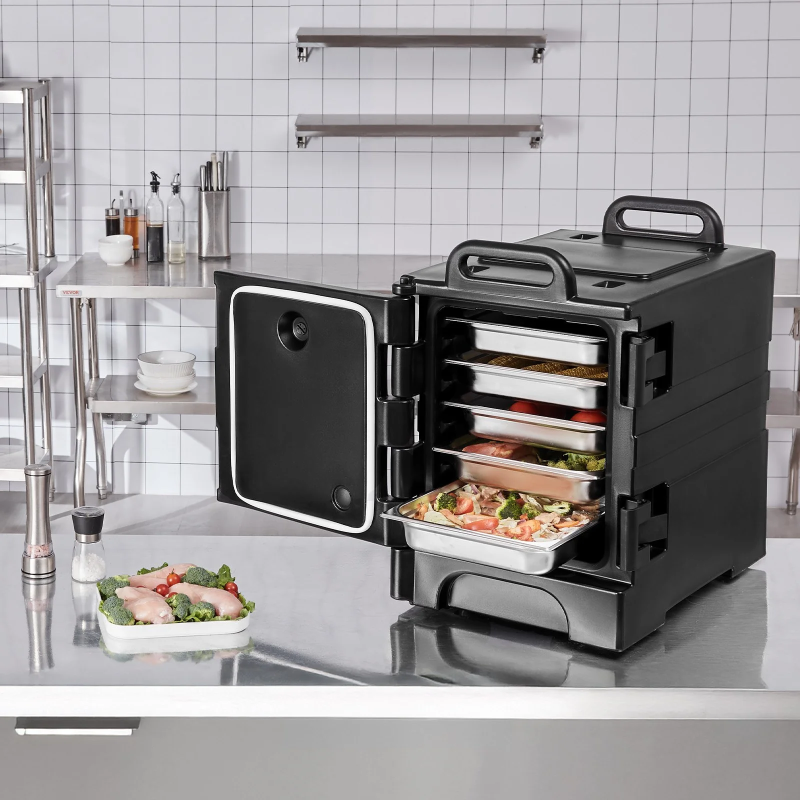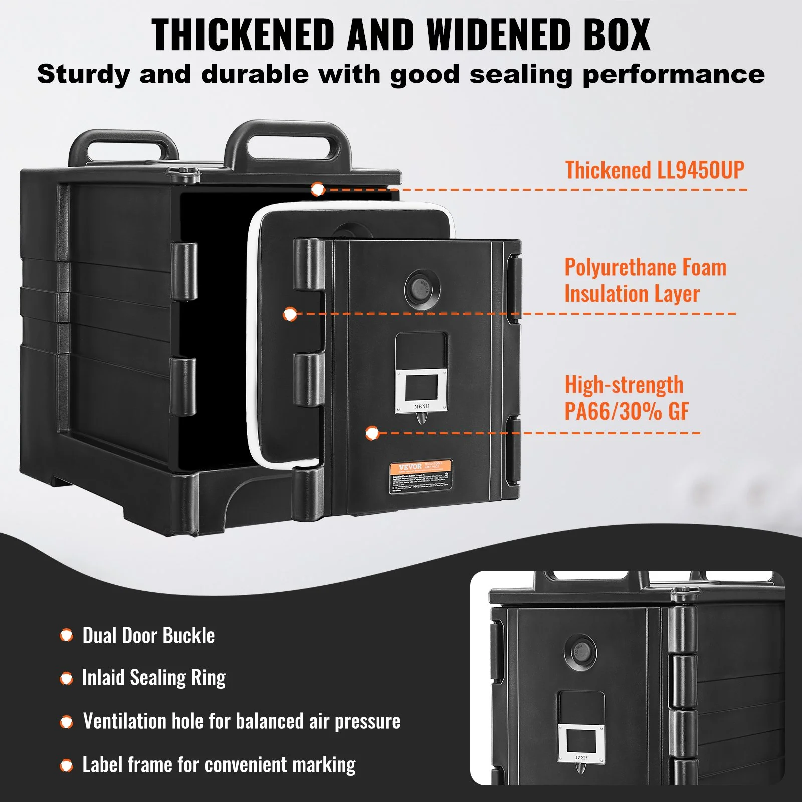 The VEVOR insulated food carrier box does not require electricity and can keep food warm for 4-6 hours or chilled for 3-5 hours. It retains temperature and locks in freshness, eliminating worries about food cooling down or spoiling and messy storage.