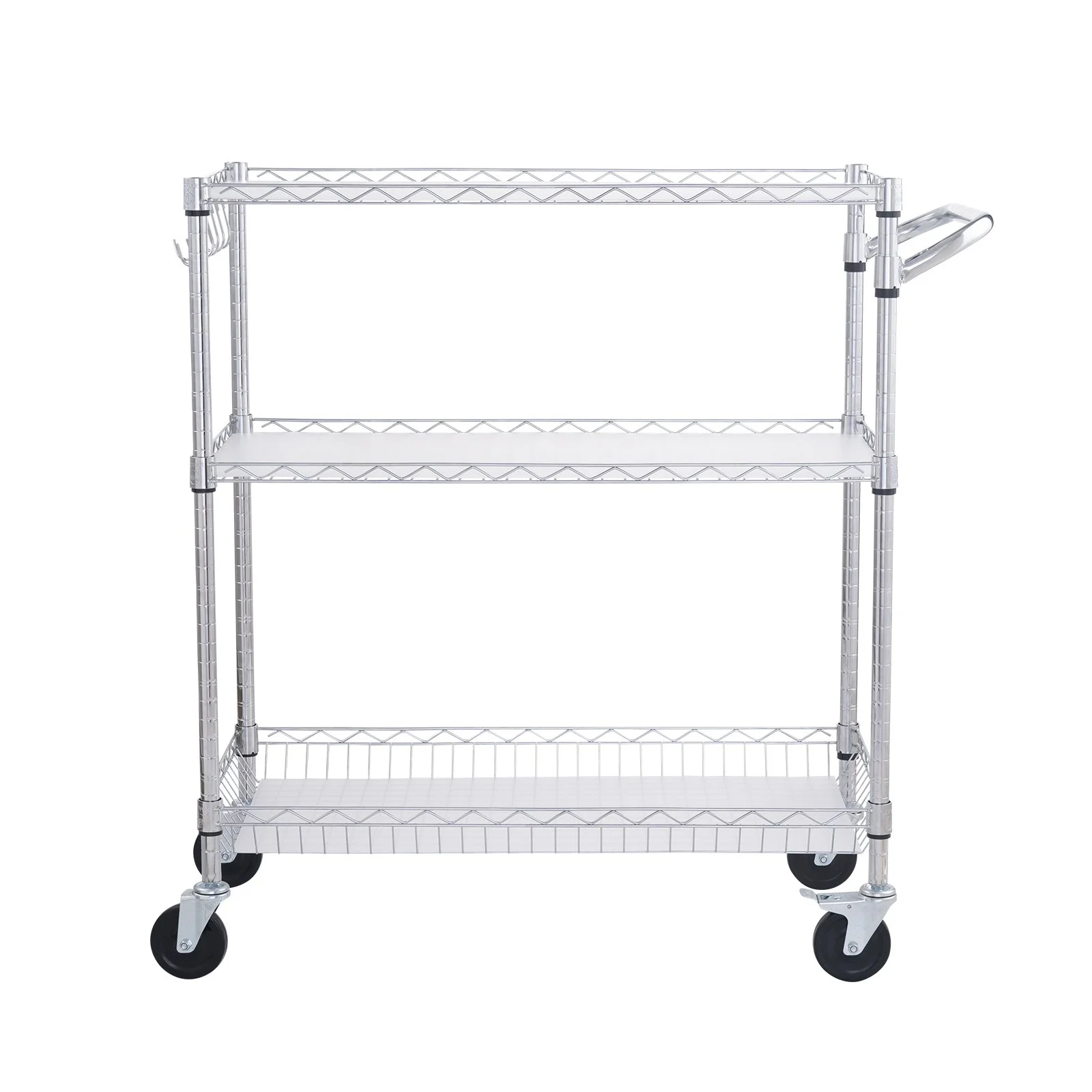 6 additional hooks serve to hang all kinds of items. The raised edges of each shelf can prevent items from slipping during transport. No matter where you go, your new utility cart will be right there with you! And the curved handle makes the moving process worry-free and labor-saving. Get more done without hurting yourself!