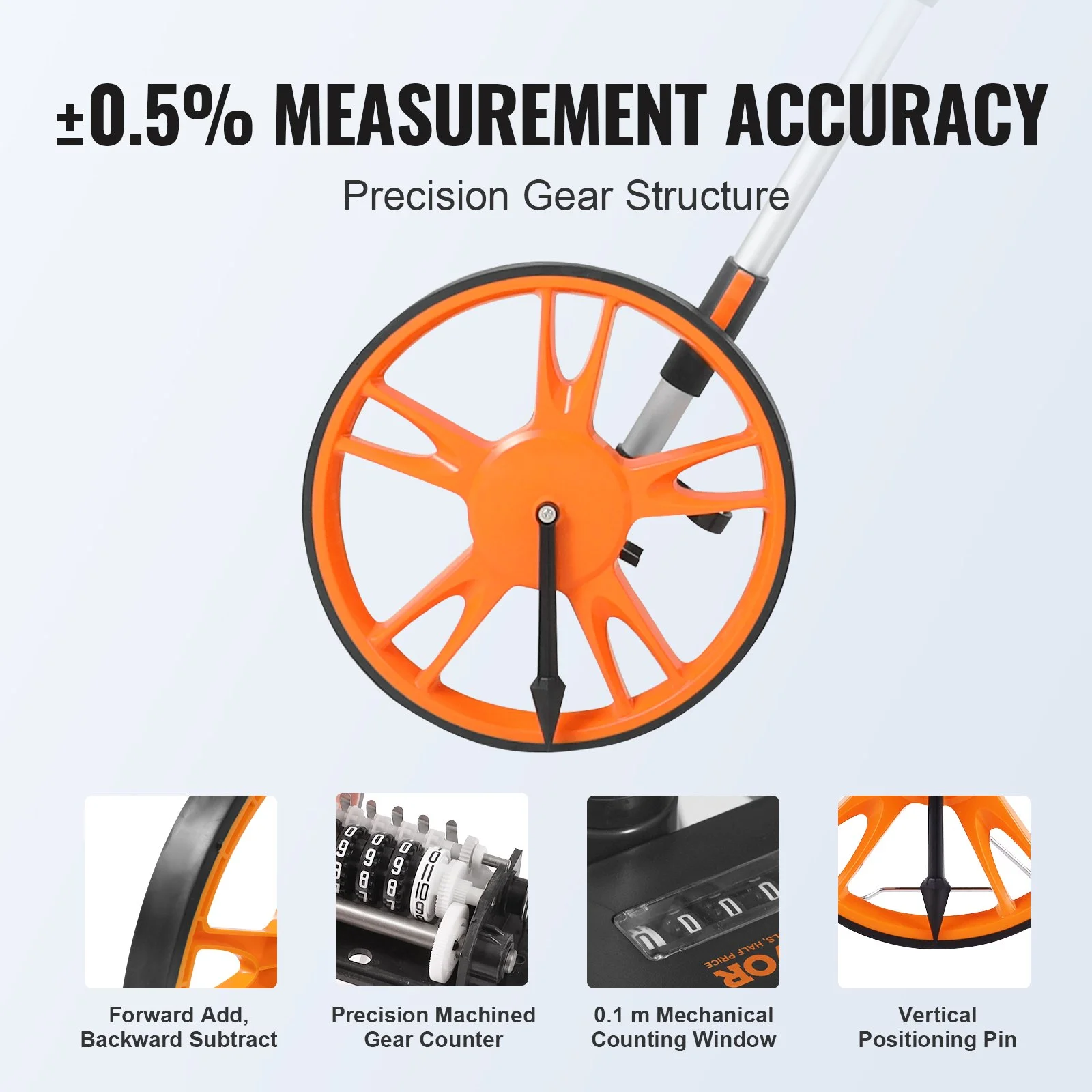Feet units, measuring range up to 99999.9 meters, designed with precision gear structure for accuracy up to ±0.5%, display resolution of 0.1 ft. Forward counting for increase, backward counting for decrease, effectively avoiding errors.