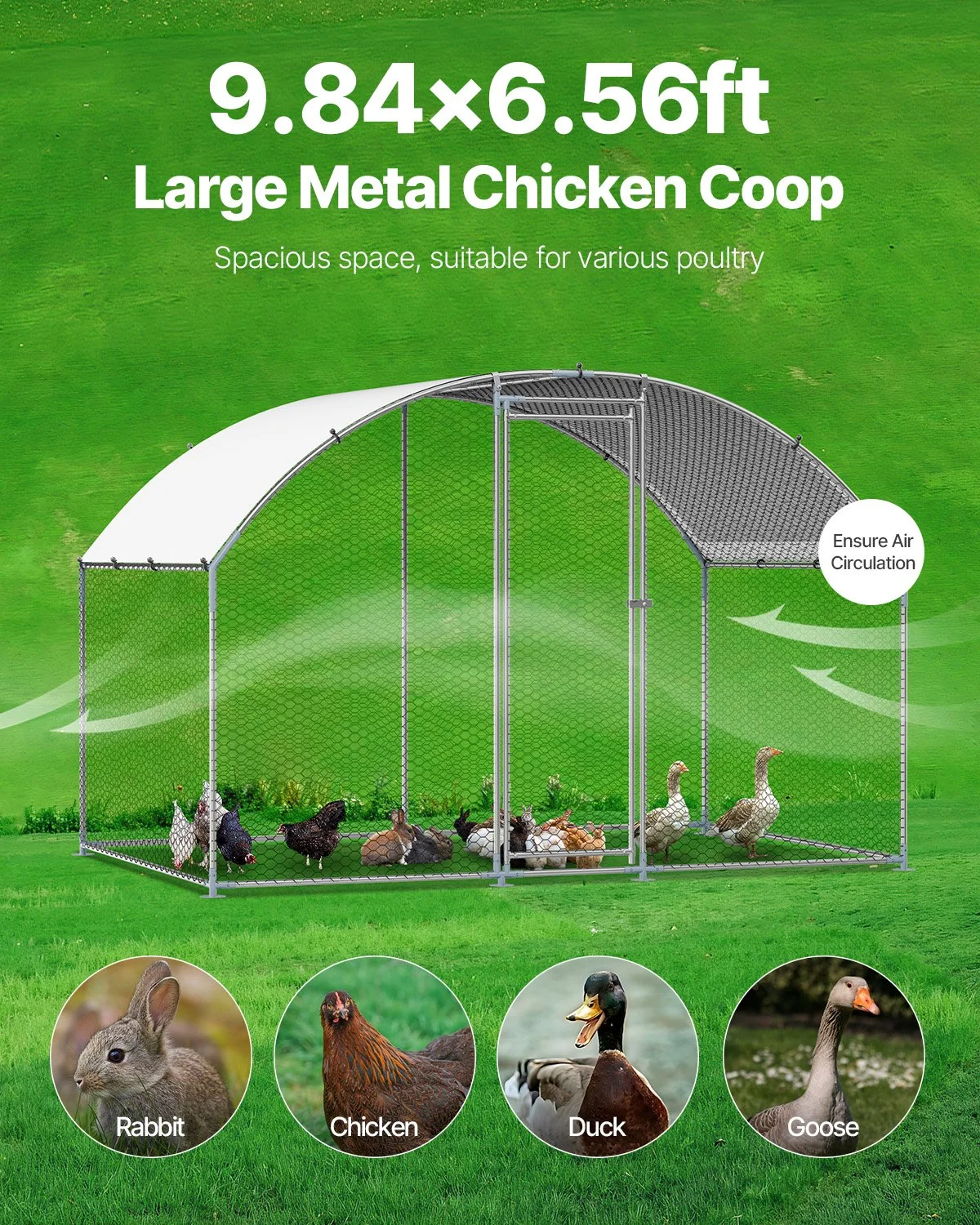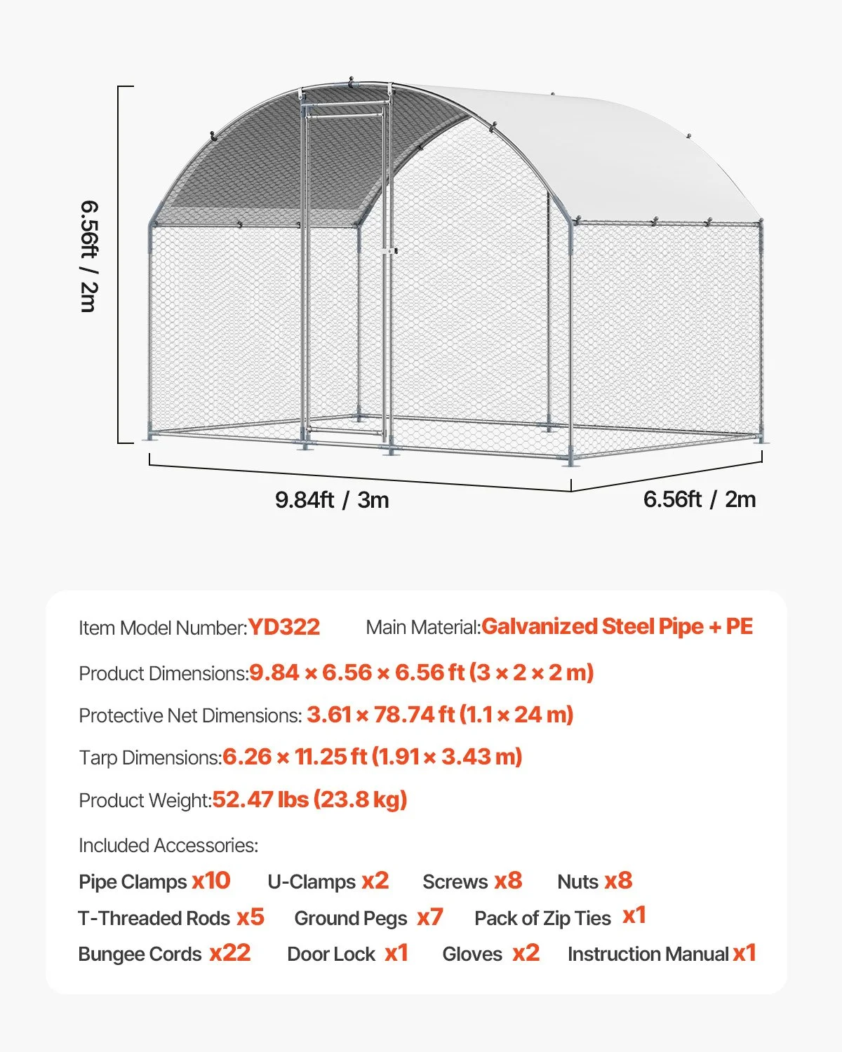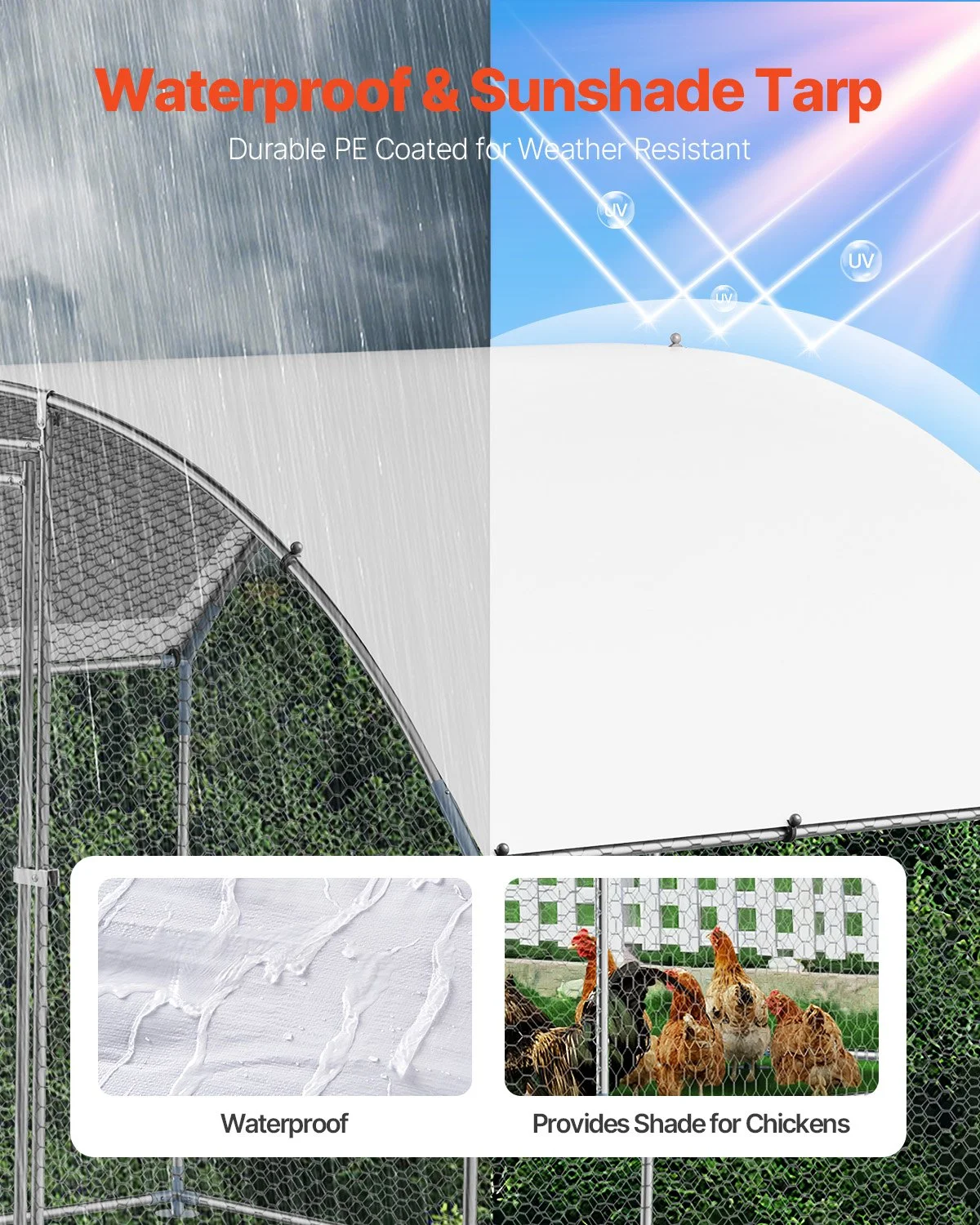 Crafted from galvanized steel pipes, and rigorously tested against salt spray, this large chicken coop withstands harsh weather conditions like rain, wind, and sun exposure, ensuring long-term stability and securety.