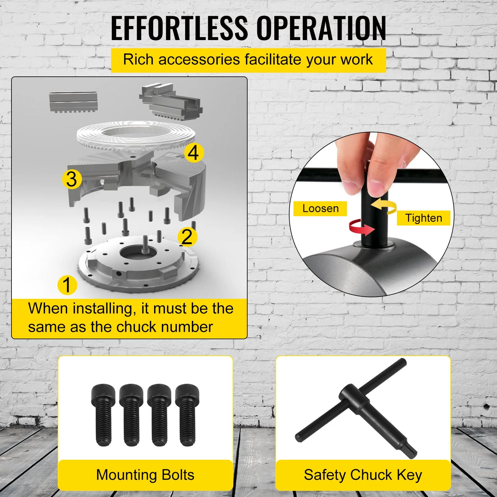 The 4-jaw lathe chuck works accurately, bearing tolerance is of ≤ 0.003 inch / 0.07 mm to ensure satisfying metal processing. The accessory screws make the scroll chuck highly adaptable and can be used with the same series of jaws as the chuck.