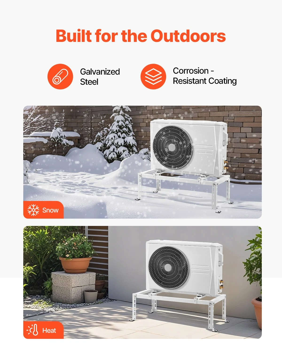 The mini split ground stand is made from galvanized steel with a powder-coated finish, offering exceptional durability and corrosion-resistance to safeguard your AC from harsh weather conditions