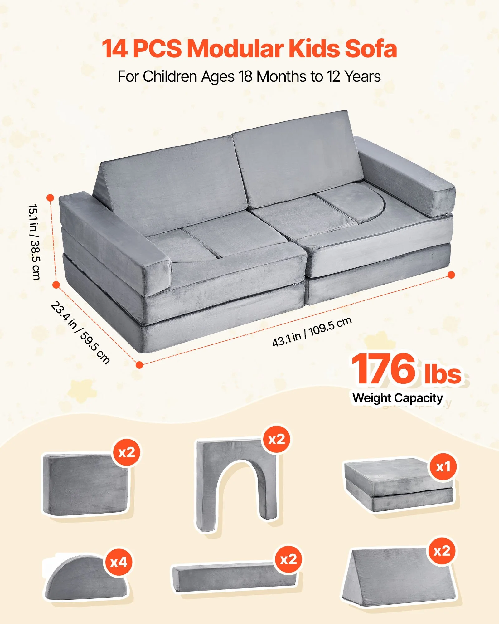 This sofa set includes 14 pieces: 2 square cushions, 2 concave blocks, 4 C-shaped pieces, 2 O-shaped rings, 2 triangular backrests, and 2 long armrests. Beyond offering a cozy seating area, this play couch is designed to fully spark your child’s creativity