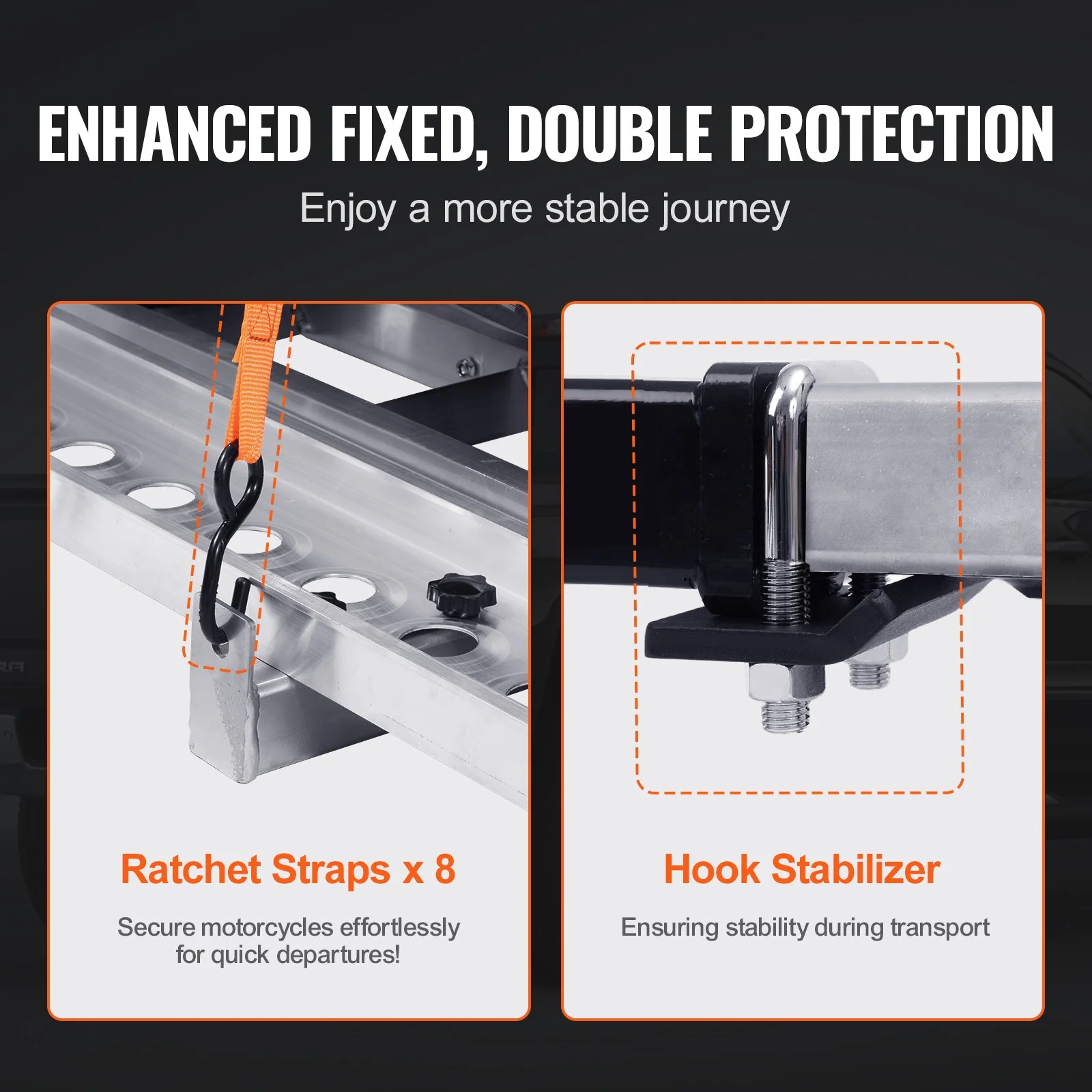 Our aluminum motorcycle hitch carrier with 600 weight capacity, can easily carry 2 motorcycles, ensuring stable support for motorcycles of all sizes, from lightweights to heavyweights, during transport.