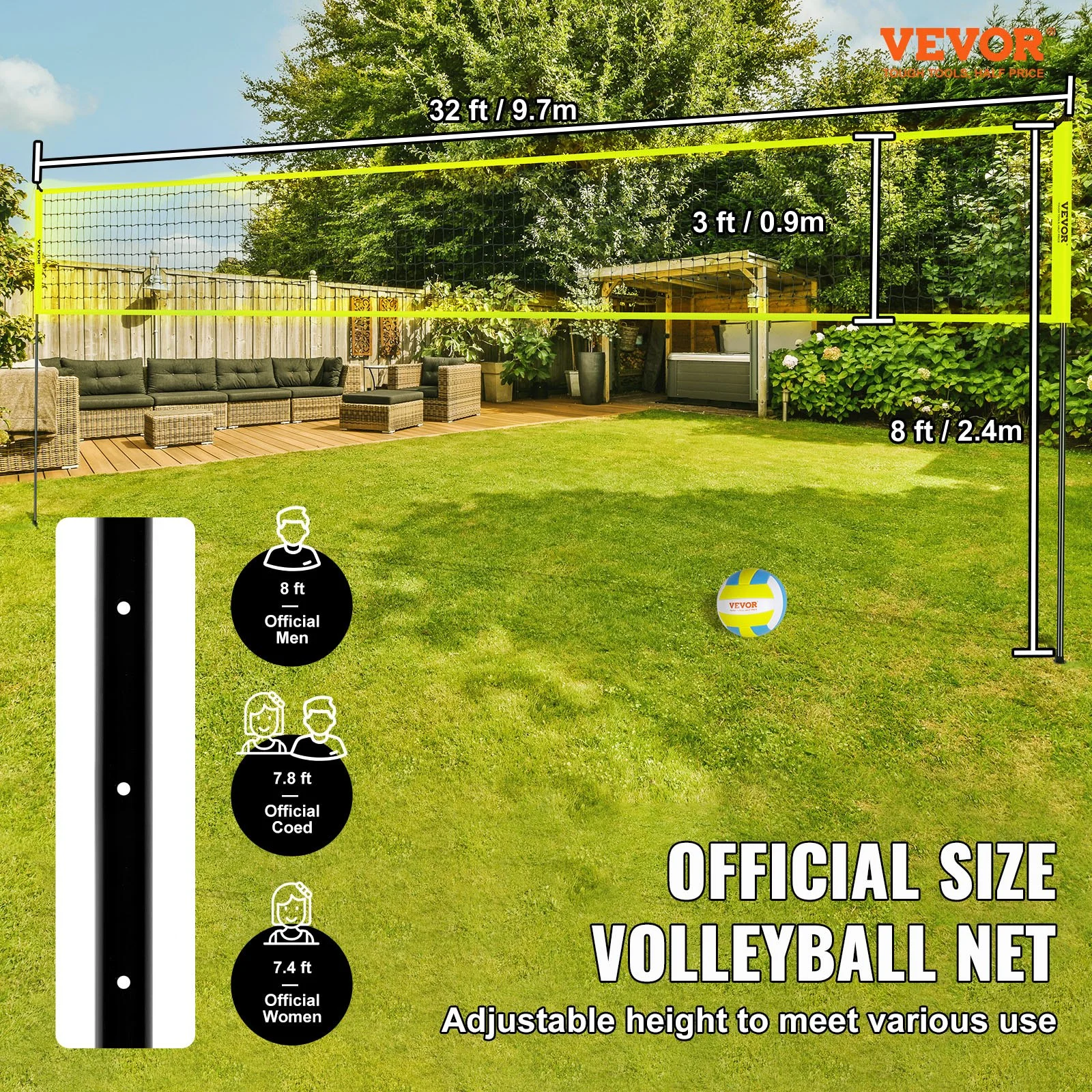 This outdoor volleyball net comes with an adjustable height feature, catering to various official game standards. Set it at 7.4 feet for official women's matches, 7.8 feet for official coed games, and 8 feet for official men's tournaments.