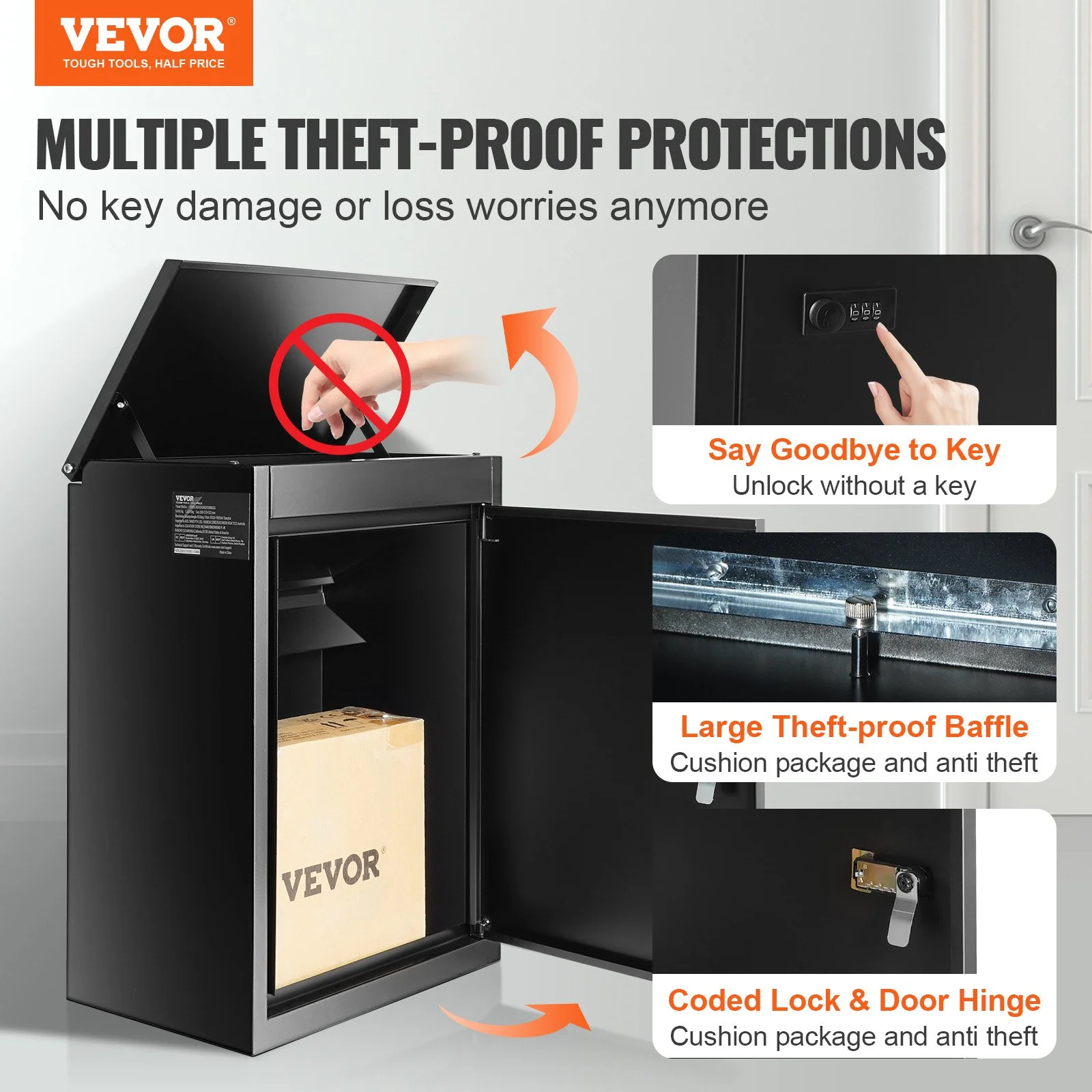Don't worry about losing keys and being unable to retrieve your parcels. VEVOR 15.4" x 10.6" x 20.5" package delivery box for outside is equipped with a secure password lock and internal hinge to ensure your packages are well-protected. A large anti-theft baffle has also been added to the drop slot, preventing parcels from being fished out.