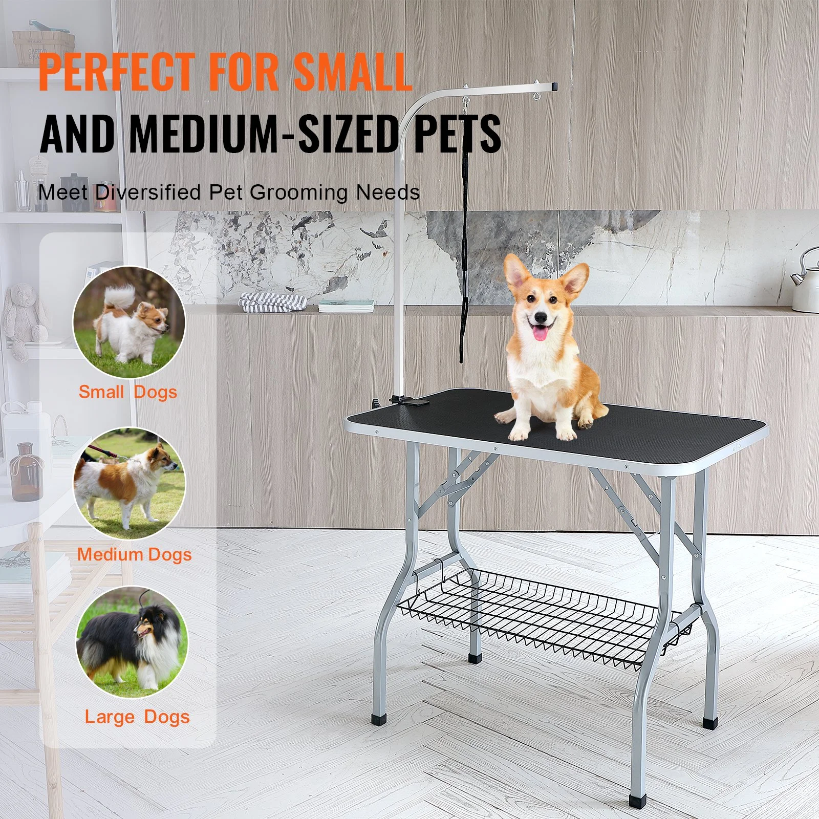 The anti-bend support frame is foldable and sturdy, preventing bending. Dual dog leashes ensure pets are safely restrained. The 31.5" elevated legs reduce bending, and non-slip, heat-resistant rubber foot pads provide stability even on smooth floors. Additionally, a storage shelf accommodates leashes, toys, brushes, clippers, and other grooming supplies and accessories.