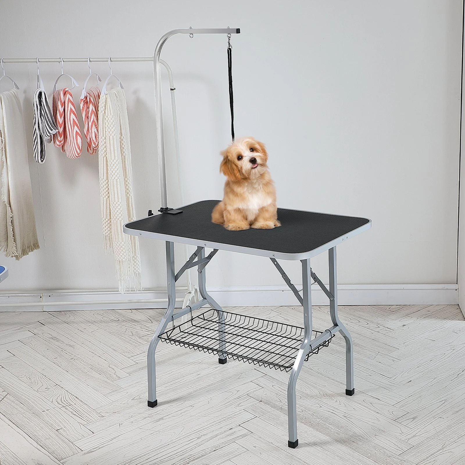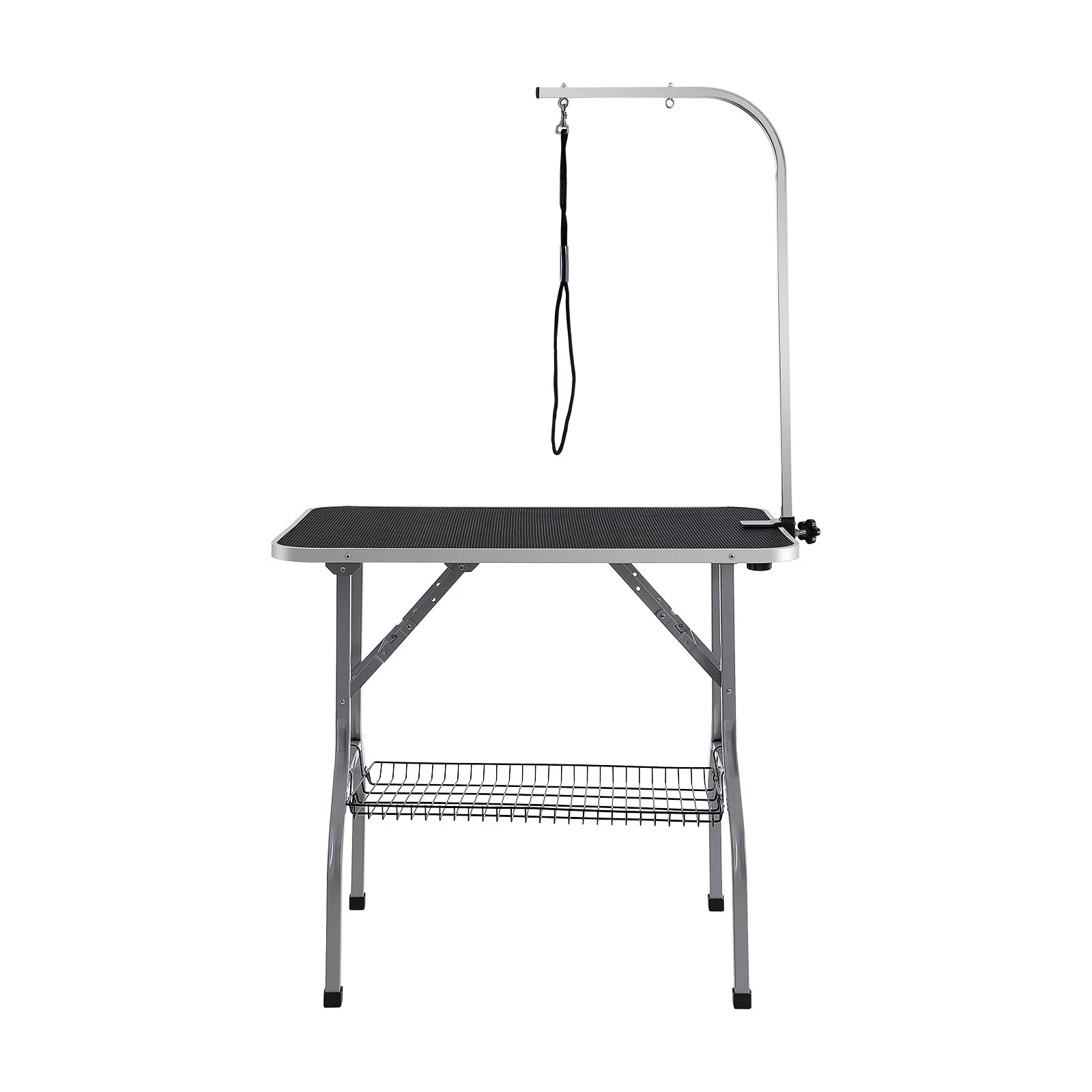 This pet grooming table is quick and simple to install with just four steps: Step 1 - unfold the grooming table and place it level; Step 2 - clamp the two iron fixtures securely onto the table; Step 3 - attach the H-shaped double arms; Step 4 - finally, install the storage shelf.