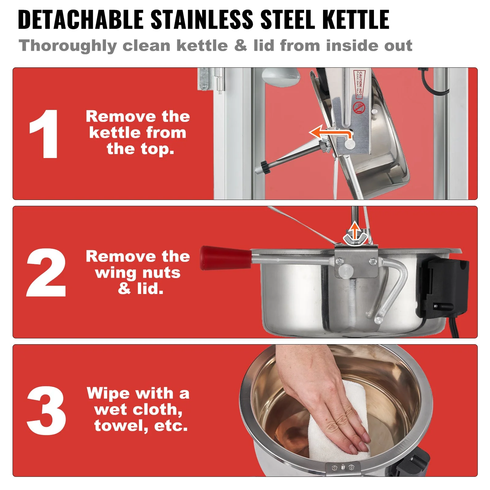 This movie theater style popcorn machine is made of a cold-rolled plate frame and tempered glass panels, designed for frequent use. The door with a magnetic latch allows for quick access and enhances the presentation of the popcorn inside. The printed graphics on top may also attract some hungry eyes. Additionally, the wing nut on the kettle allows for easy removal of the lid for thorough cleaning. Easy cleaning will extend the machine's lifespan.