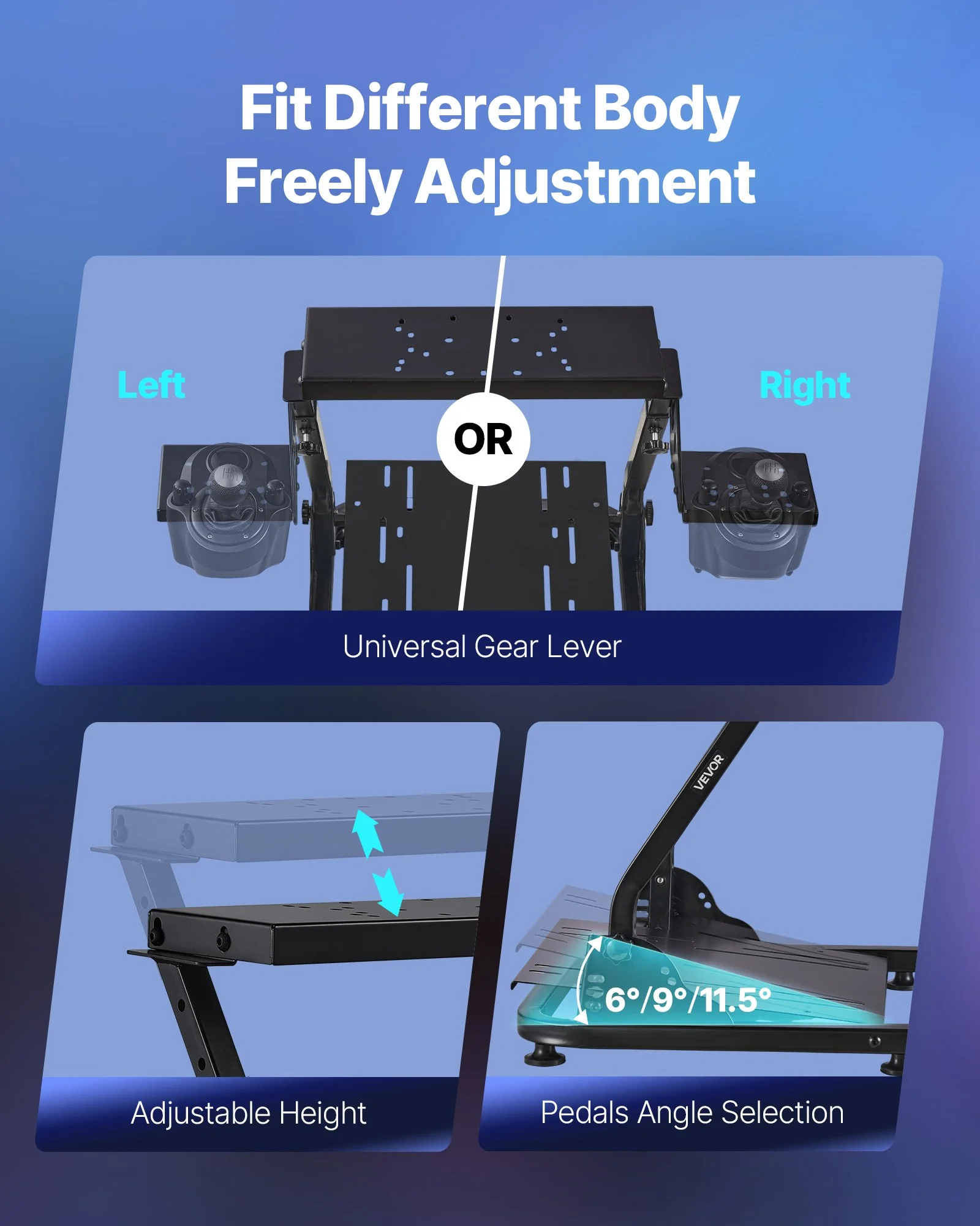 The steering wheel stand has adjustable height and angle. The shifter mount can be set left or right and adjusted in height. The pedal platform offers 9 tilt levels from 3° to 17° for ideal driving position every time