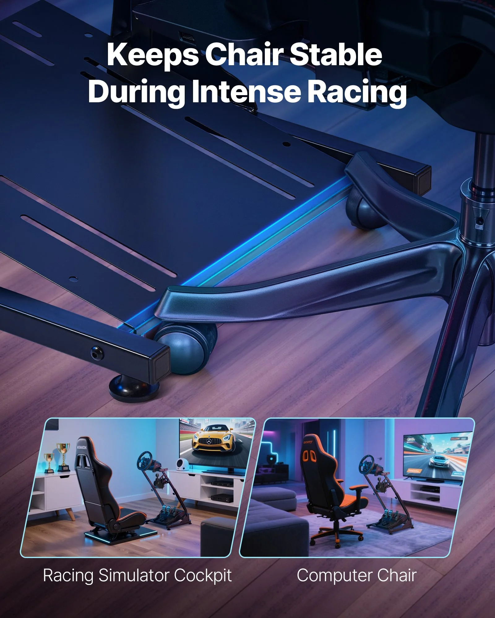 A front crossbar at the base effectively blocks your chair wheels from sliding forward. Even during aggressive maneuvers, you’ll maintain a stable seating position throughout your racing session
