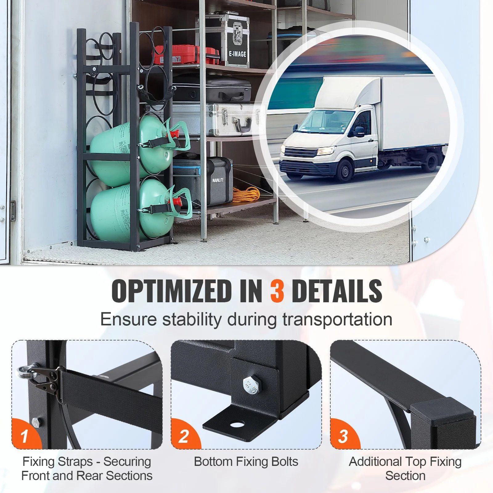 Tilted storage shelves prevent tank sliding, reducing the risk of accidents. Carbon steel fixing bars on both sides are designed for vehicles, with pre-drilled holes for various carriages. And the tanks securely attach to the vehicle without shifting using included screws, ensuring safe transport.