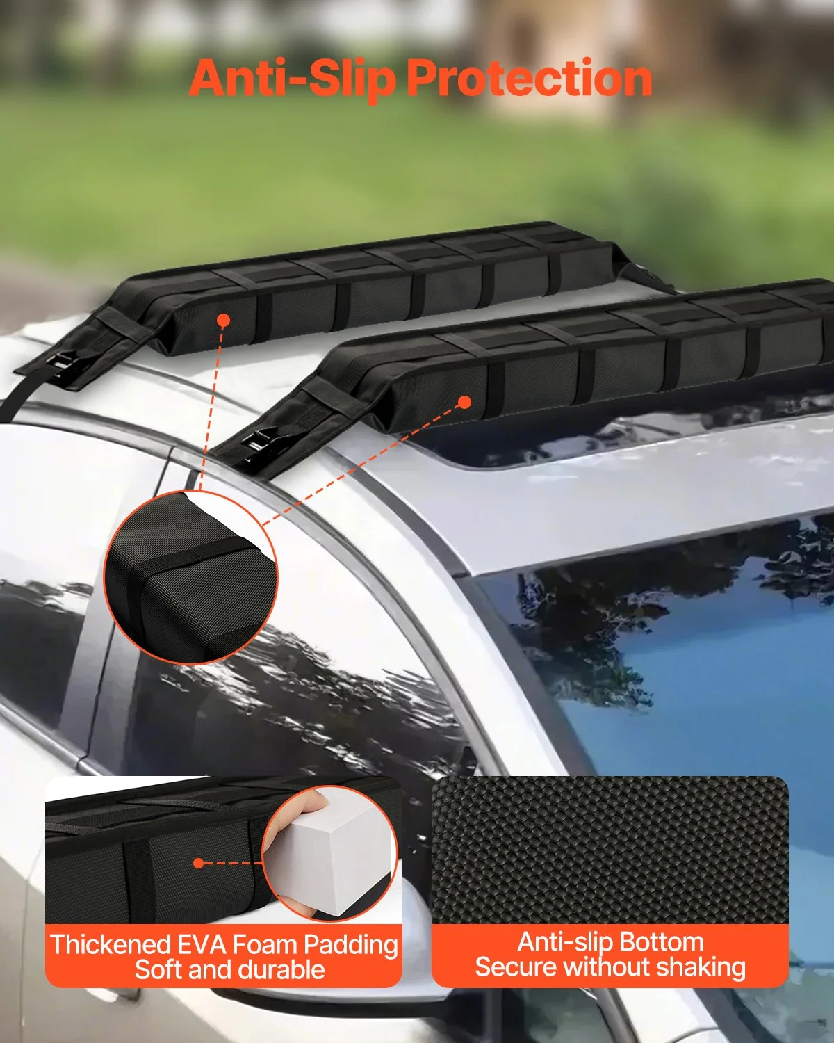 With a non-slip bottom, the kayak roof rack pads firmly grip your roof while protecting the roof surface from scratches and reducing wind noise. The thickened padding provides soft, shock-absorbing protection, minimizing vibrations during travel.