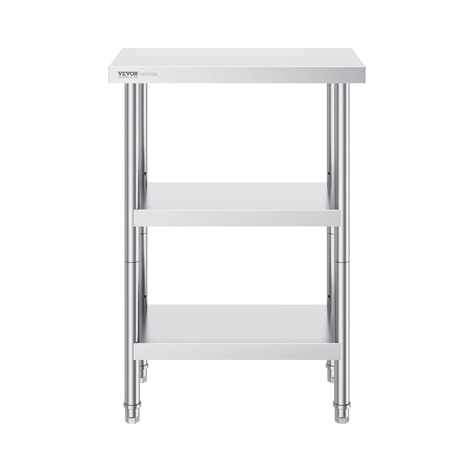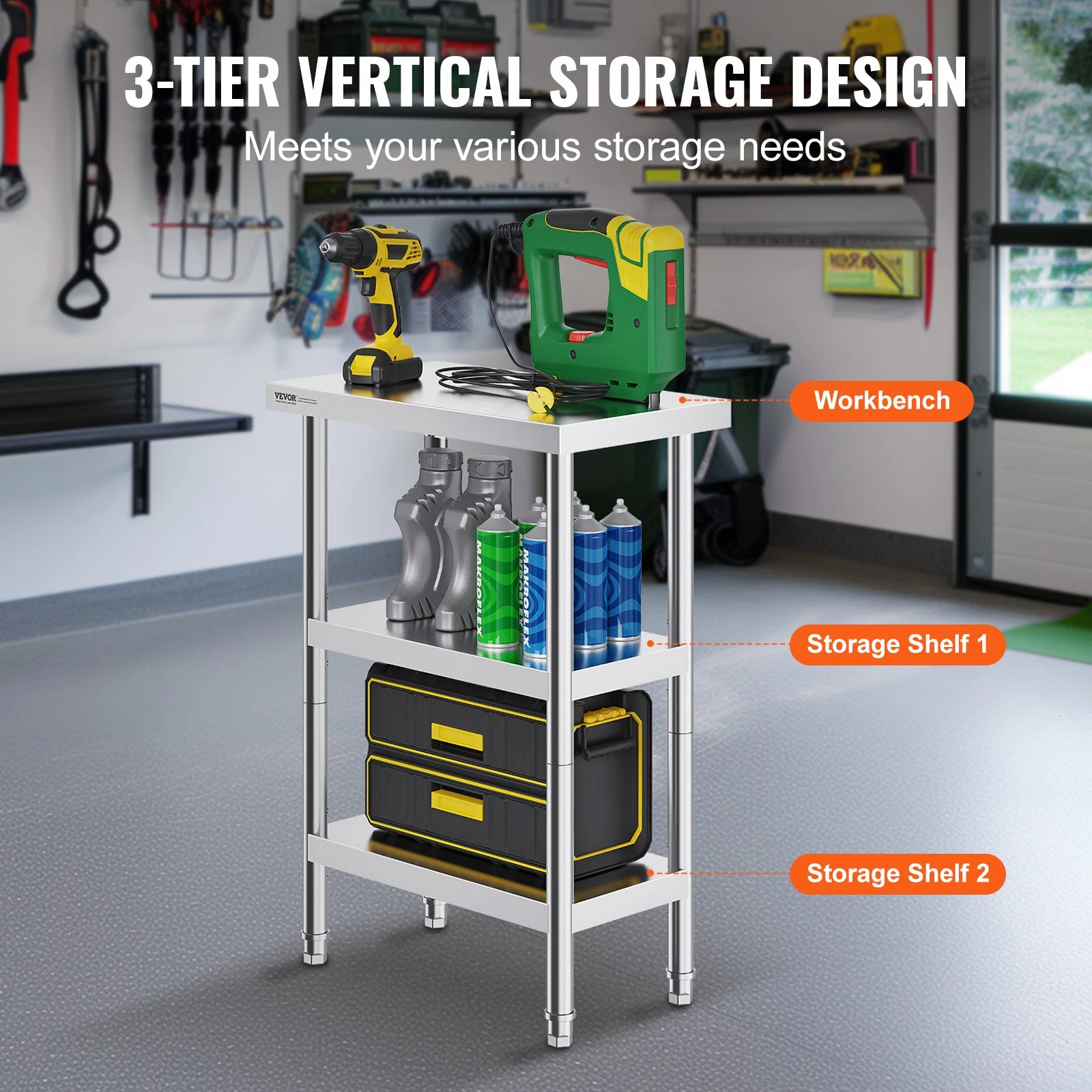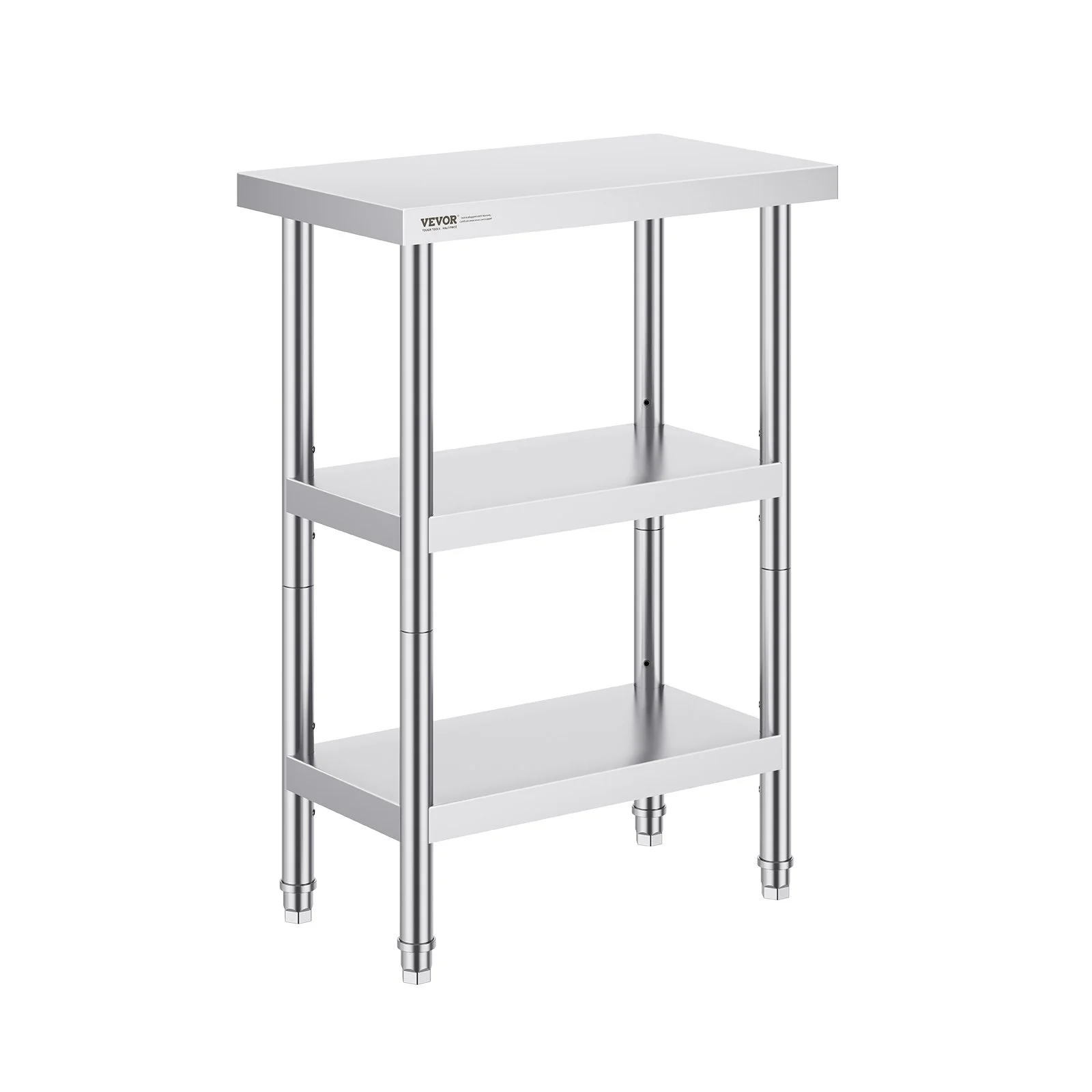 This work table, measuring 14 x 24 x 34 inch, is made from SUS201 stainless steel for the tabletop, shelves, and legs. It offers superior rust resistance, a sleek appearance, and a smooth surface that is easy to clean with a simple wipe. NSF certified, it meets strict public health standards, ensuring long-lasting protection for your health.