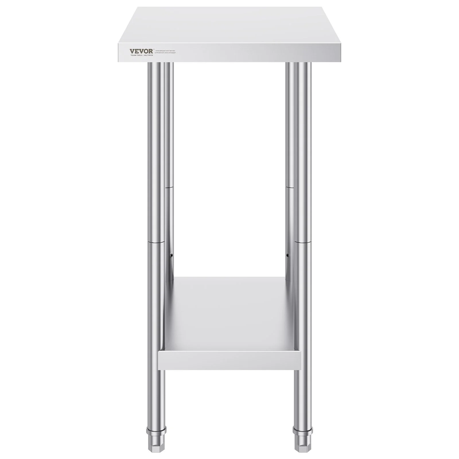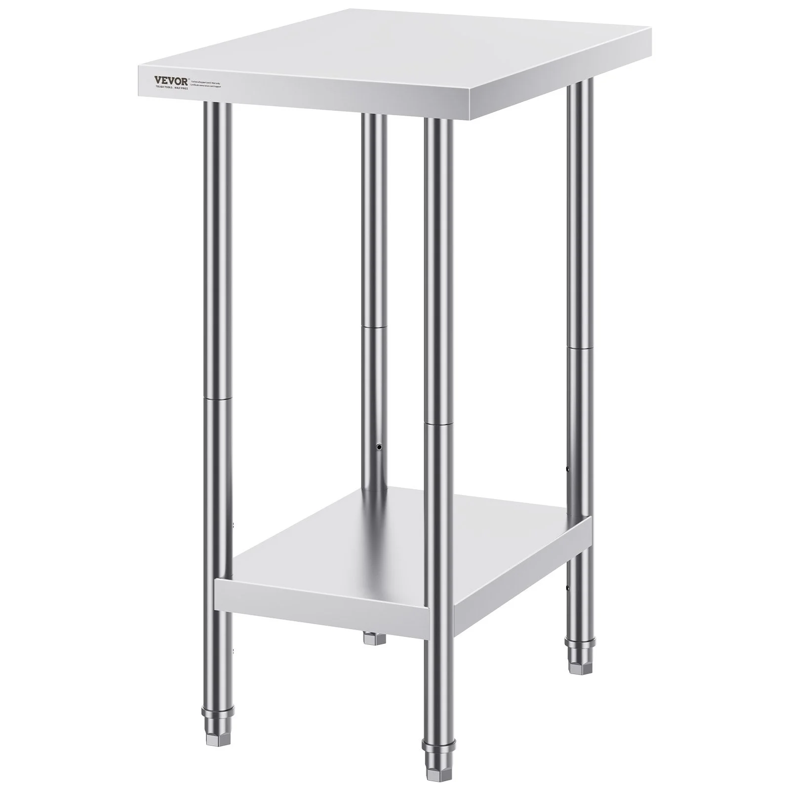 This work table, measuring 24 x 18 x 34 inch, is made from SUS201 stainless steel for the tabletop, shelves, and legs. It offers superior rust resistance, a sleek appearance, and a smooth surface that is easy to clean with a simple wipe. NSF certified, it meets strict public health standards, ensuring long-lasting protection for your health.