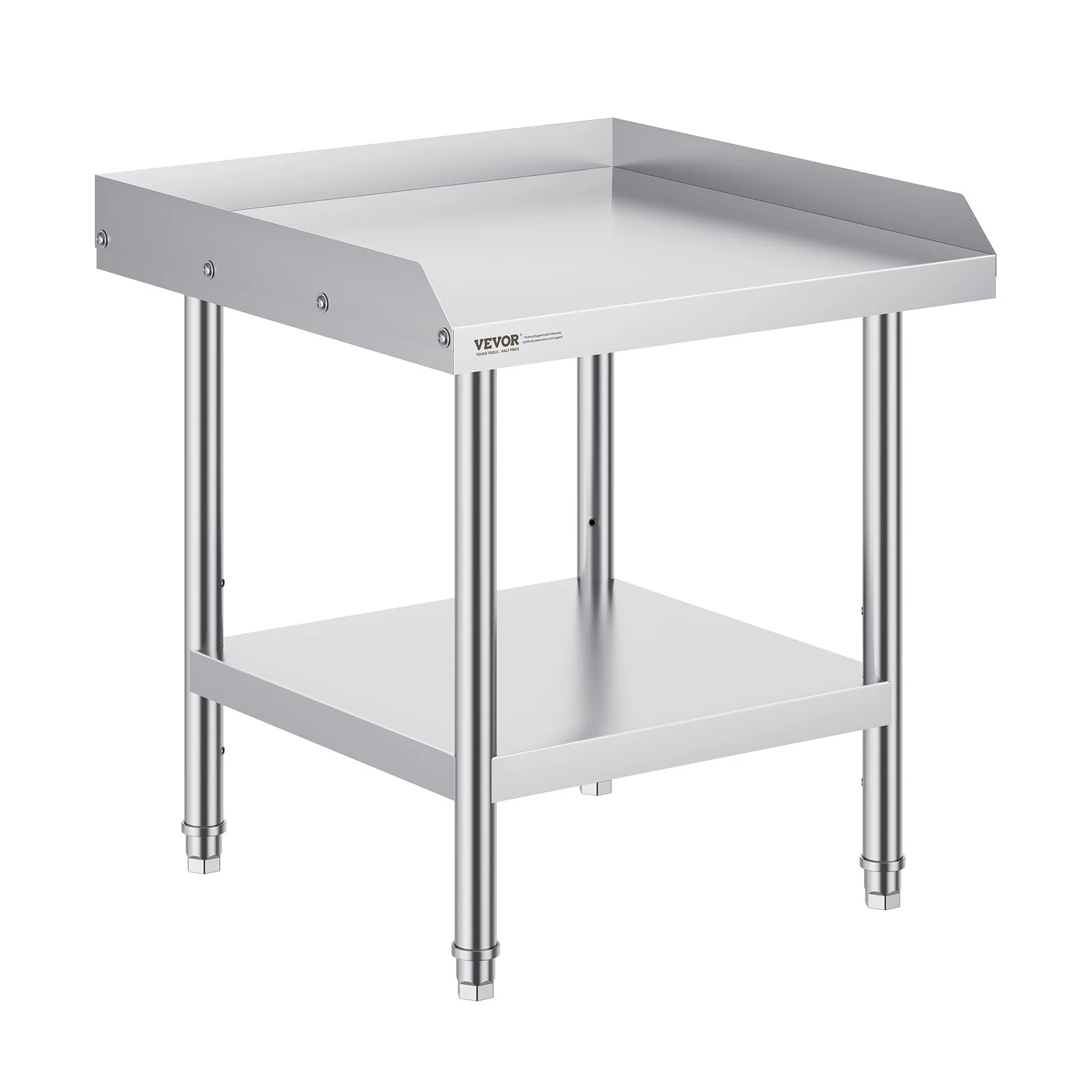 This work table, measuring 24 x 24 x 26 inch, is made from SUS201 stainless steel for the tabletop, shelves, and legs. It offers superior rust resistance, a sleek appearance, and a smooth surface that is easy to clean with a simple wipe. NSF certified, it meets strict public health standards, ensuring long-lasting protection for your health.