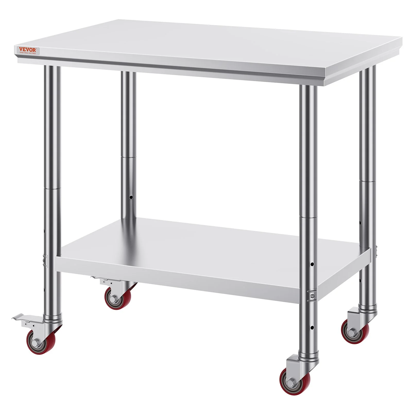With an upgraded thickness of 0.8mm, this table is sturdy and durable. The upper shelf supports up to 400 lbs, while the lower shelf supports up to 300 lbs, providing ample storage for your supplies and allowing you to stack your favorite ingredients easily. Equipped with 4 swivel casters, including 2 with brakes, the table remains stable and can be easily moved to any location.