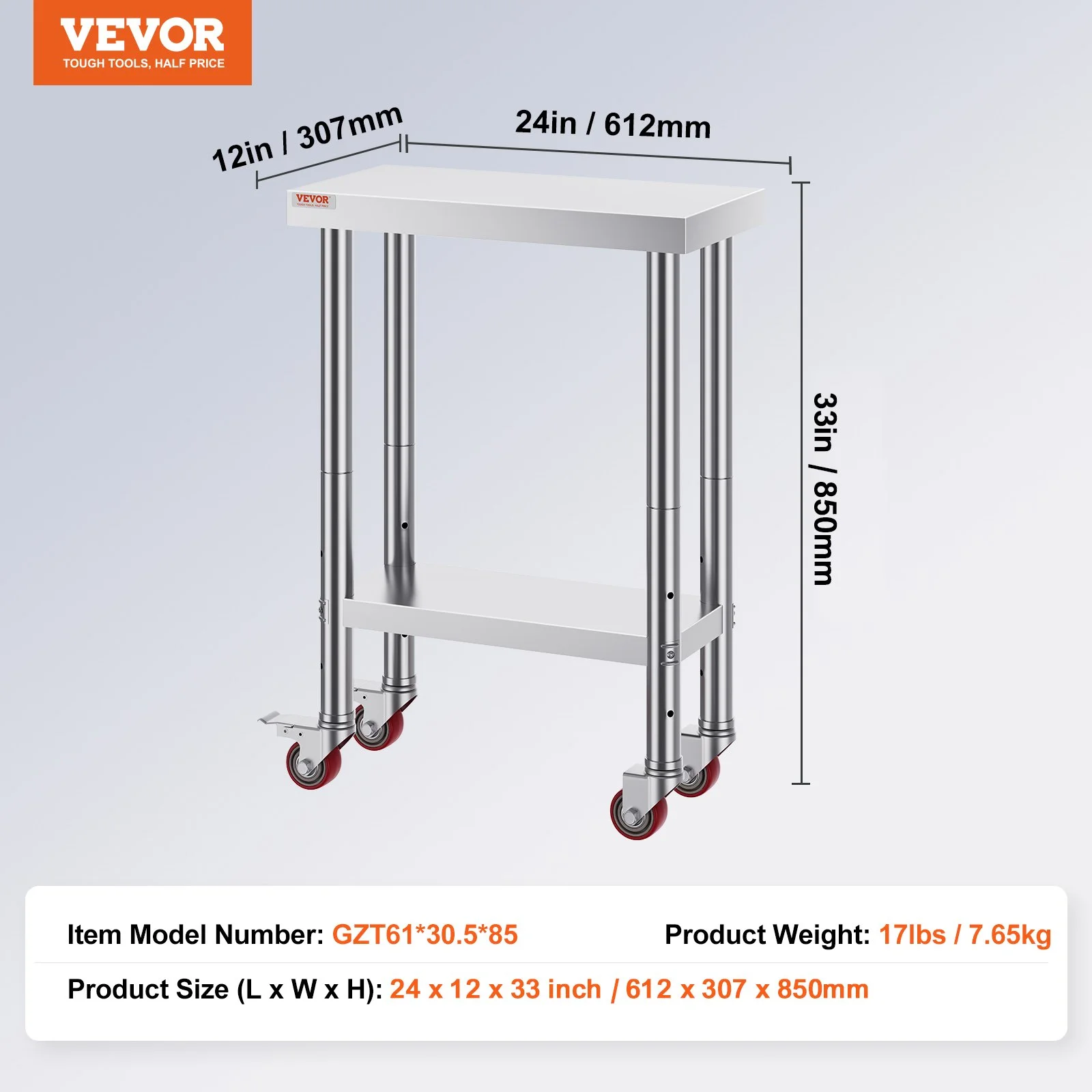 This work table, measuring 12 x 24 x 34 inch, is made from SUS201 stainless steel for the tabletop, shelves, and legs. It offers superior rust resistance, a sleek appearance, and a smooth surface that is easy to clean with a simple wipe. NSF certified, it meets strict public health standards, ensuring long-lasting protection for your health.